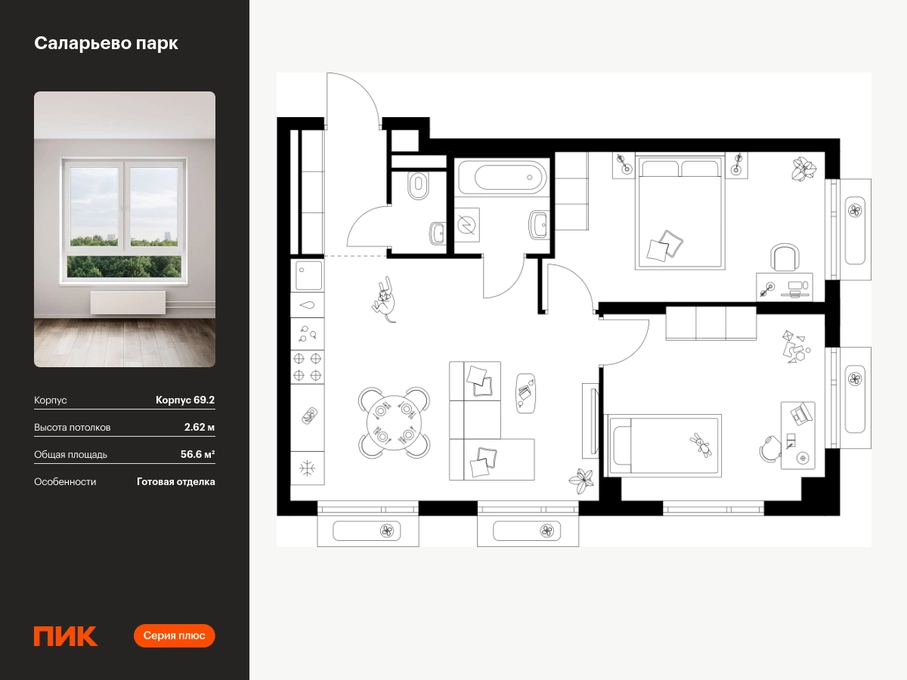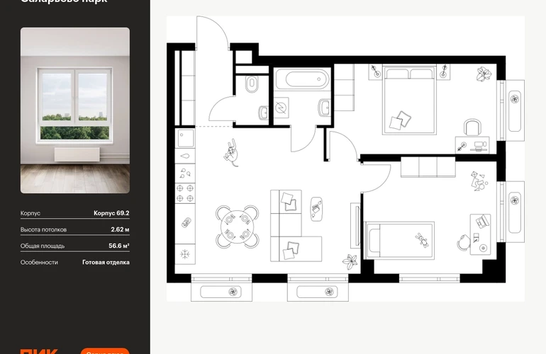 Продаётся 2-комн.квартира площадью 56.60 кв.м на 2 этаже 14 этажного дома (Корпус 69.2, секция 2) проекта ПИК Саларьево парк. Светлый просторный подъезд на уровне земли, функциональная планировка, большие окна, с отделкой. Артикул - 1023442О застройщике