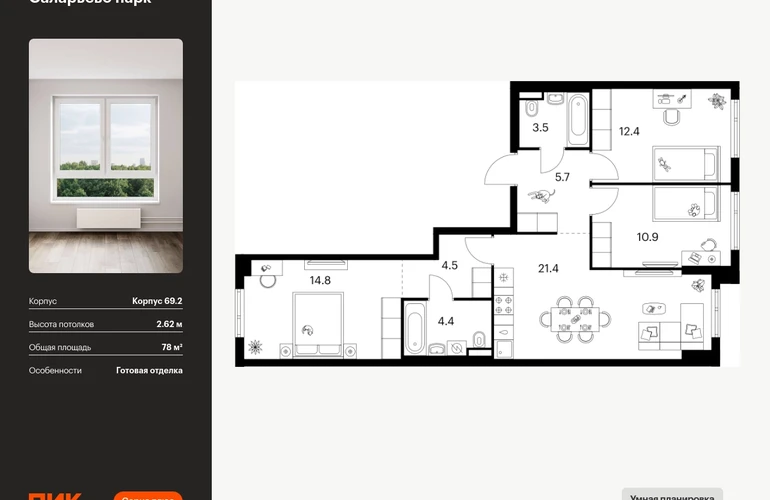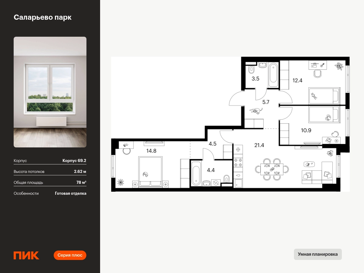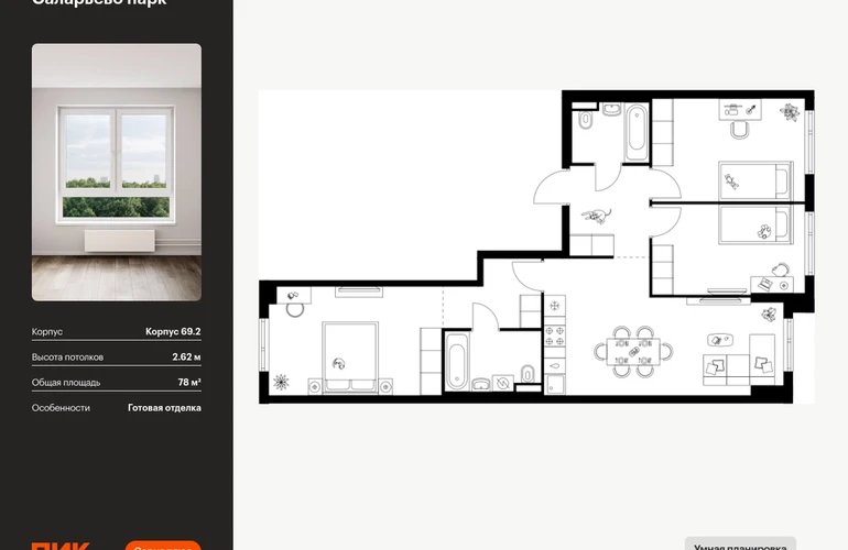 Продаётся 3-комн.квартира площадью 78.00 кв.м на 13 этаже 14 этажного дома (Корпус 69.2, секция 2) проекта ПИК Саларьево парк. Светлый просторный подъезд на уровне земли, функциональная планировка, большие окна, с отделкой. Артикул - 1023563О застройщике