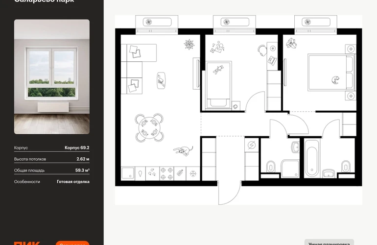 Продаётся 2-комн.квартира площадью 59.30 кв.м на 7 этаже 14 этажного дома (Корпус 69.2, секция 2) проекта ПИК Саларьево парк. Светлый просторный подъезд на уровне земли, функциональная планировка, большие окна, с отделкой. <br> <br>Жилой район «Саларьево парк» расположен в Новой Москве, в четырёх километрах от МКАД по Киевскому шоссе. Две станции метро: «Саларьево» и «Филатов луг» — находятся в пешей доступности от проекта. Дойти до них можно за 5–10 минут. В квартале уже создана качественная среда, где есть абсолютно всё для полноценной жизни, работы и отдыха. <br> <br>«Саларьево парк» — не просто квартал, а полноценный жилой район, который отличается разноплановой архитектурой. Над концепцией квартала работали несколько ведущих архитектурных бюро, которые стремились добиться разнообразия в фасадных решениях. Ярким примером такого подхода станет корпус 83, который относится к «Серии плюс». <br> <br>Новый корпус 83 был создан по принципам южной архитектуры: расслабленный и лаконичный силуэт зданий, привлекающий к себе внимание. Архитектурная изюминка 83-го корпуса — террасы и фигурные балконы. Вместе с окнами и другими акцентными элементами они создают уникальный облик здания, отсылая нас к изысканной южной архитектуре. <br> <br>Все корпуса в квартале гармонично сочетаются, образуя единую городскую среду. Здесь приятно гулять и проводить время на улице всей семьёй. <br> <br>В «Саларьево парке» создана уникальная образовательная среда, включающая в себя шесть школ, рассчитанных на 6 250 учеников. Две из них уже открыты, их посещает 2 300 детей. Также на территории «Саларьево парка» находится 12 детских садов, один из которых с бассейном. Сейчас уже открыты 7 садов. <br> <br>В «Саларьево парке» открыта уникальная игровая площадка — PlayHub «Оригами». Здесь есть ручей, горка-труба и рельефные холмы. Взрослые смогут отдохнуть в уютном кафе, пока дети играют. Также на территории проекта есть SportHub — большая спортивная зона, разделённая по интересам и возрастам. Здесь можно заниматься разными видами спорта: футболом, баскетболом, волейболом и стритболом. Зимой центральную часть площадки превращают в каток. <br> <br>Во дворах-парках жилого квартала есть места для отдыха, детские и спортивные площадки. На первых этажах домов расположены магазины, кафе и полезные сервисы. Также вблизи проекта есть несколько масштабных торговых центров. До ТЦ «Саларис» пять минут пешком, до «Рио», Metro Cash & Carry и «Леруа Мерлен» — пять минут на автомобиле. Артикул - 1023493О застройщике