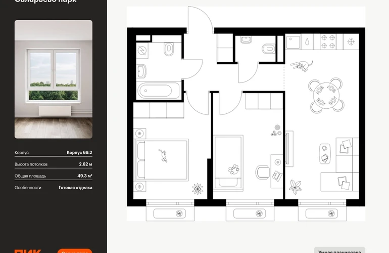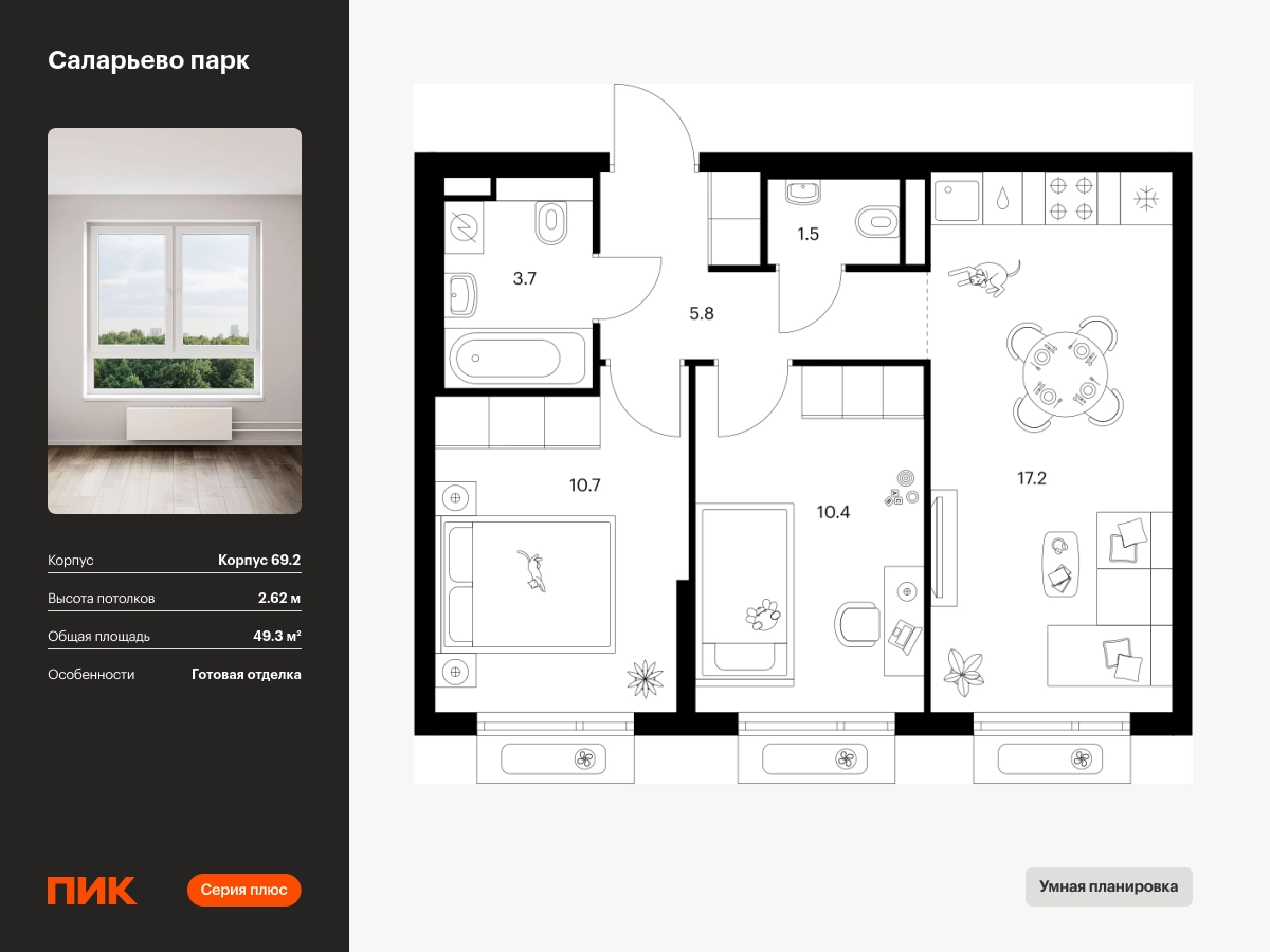 Продаётся 2-комн.квартира площадью 49.30 кв.м на 10 этаже 14 этажного дома (Корпус 69.2, секция 2) проекта ПИК Саларьево парк. Светлый просторный подъезд на уровне земли, функциональная планировка, большие окна, с отделкой. <br> <br>Жилой район «Саларьево парк» расположен в Новой Москве, в четырёх километрах от МКАД по Киевскому шоссе. Две станции метро: «Саларьево» и «Филатов луг» — находятся в пешей доступности от проекта. Дойти до них можно за 5–10 минут. В квартале уже создана качественная среда, где есть абсолютно всё для полноценной жизни, работы и отдыха. <br> <br>«Саларьево парк» — не просто квартал, а полноценный жилой район, который отличается разноплановой архитектурой. Над концепцией квартала работали несколько ведущих архитектурных бюро, которые стремились добиться разнообразия в фасадных решениях. Ярким примером такого подхода станет корпус 83, который относится к «Серии плюс». <br> <br>Новый корпус 83 был создан по принципам южной архитектуры: расслабленный и лаконичный силуэт зданий, привлекающий к себе внимание. Архитектурная изюминка 83-го корпуса — террасы и фигурные балконы. Вместе с окнами и другими акцентными элементами они создают уникальный облик здания, отсылая нас к изысканной южной архитектуре. <br> <br>Все корпуса в квартале гармонично сочетаются, образуя единую городскую среду. Здесь приятно гулять и проводить время на улице всей семьёй. <br> <br>В «Саларьево парке» создана уникальная образовательная среда, включающая в себя шесть школ, рассчитанных на 6 250 учеников. Две из них уже открыты, их посещает 2 300 детей. Также на территории «Саларьево парка» находится 12 детских садов, один из которых с бассейном. Сейчас уже открыты 7 садов. <br> <br>В «Саларьево парке» открыта уникальная игровая площадка — PlayHub «Оригами». Здесь есть ручей, горка-труба и рельефные холмы. Взрослые смогут отдохнуть в уютном кафе, пока дети играют. Также на территории проекта есть SportHub — большая спортивная зона, разделённая по интересам и возрастам. Здесь можно заниматься разными видами спорта: футболом, баскетболом, волейболом и стритболом. Зимой центральную часть площадки превращают в каток. <br> <br>Во дворах-парках жилого квартала есть места для отдыха, детские и спортивные площадки. На первых этажах домов расположены магазины, кафе и полезные сервисы. Также вблизи проекта есть несколько масштабных торговых центров. До ТЦ «Саларис» пять минут пешком, до «Рио», Metro Cash & Carry и «Лемана про» — пять минут на автомобиле. Артикул - 1023522О застройщике