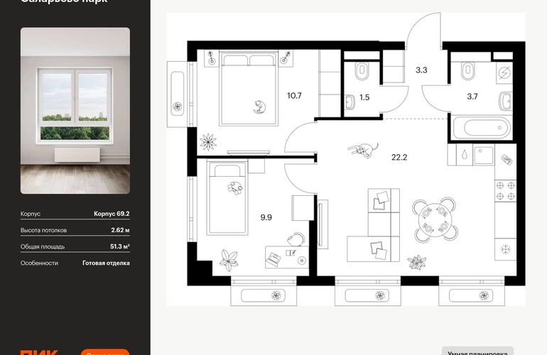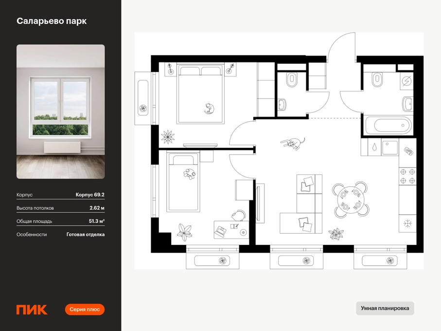 Продаётся 2-комн.квартира площадью 51.30 кв.м на 10 этаже 14 этажного дома (Корпус 69.2, секция 2) проекта ПИК Саларьево парк. Светлый просторный подъезд на уровне земли, функциональная планировка, большие окна, с отделкой. Жилой район «Саларьево парк» расположен в Новой Москве, в четырёх километрах от МКАД по Киевскому шоссе. Две станции метро: «Саларьево» и «Филатов луг», — находятся в пешей доступности от проекта. Дойти до них можно за 5–10 минут. В квартале уже создана качественная среда, где есть абсолютно всё для полноценной жизни, работы и отдыха. «Саларьево парк» — не просто квартал, а полноценный жилой район, который отличается разноплановой архитектурой. Над концепцией квартала работали несколько ведущих архитектурных бюро, которые стремились добиться разнообразия в фасадных решениях. Ярким примером такого подхода станут корпуса 82 и 83, которые относятся к «Серии плюс». Новый корпус 83 был создан по принципам южной архитектуры: расслабленный и лаконичный силуэт зданий, привлекающий к себе внимание. Архитектурная изюминка 83-го корпуса — террасы и фигурные балконы. Вместе с окнами и другими акцентными элементами они создают уникальный облик здания, отсылая нас к изысканной южной архитектуре. Все корпуса в квартале гармонично сочетаются, образуя единую городскую среду. Здесь приятно гулять и проводить время на улице всей семьёй. В «Саларьево парке» создана уникальная образовательная среда, включающая в себя шесть школ, рассчитанных на 6 250 учеников. Четыре из них уже открыты, их посещает 2 300 детей. Также на территории «Саларьево парка» находится 12 детских садов, один из которых с бассейном. Сейчас уже открыты 8 садов. В «Саларьево парке» открыта уникальная игровая площадка — PlayHub «Оригами». Здесь есть ручей, горка-труба и рельефные холмы. Взрослые смогут отдохнуть в уютном кафе, пока дети играют. Также на территории проекта есть SportHub — большая спортивная зона, разделённая по интересам и возрастам. Здесь можно заниматься разными видами спорта: футболом, баскетболом, волейболом и стритболом. Зимой центральную часть площадки превращают в каток. Во дворах-парках жилого квартала есть места для отдыха, детские и спортивные площадки. На первых этажах домов расположены магазины, кафе и полезные сервисы. Также вблизи проекта есть несколько масштабных торговых центров. До ТЦ «Саларис» пять минут пешком, до «Рио», Metro Cash & Carry и «Леруа Мерлен» — пять минут на автомобиле. Артикул - 1023523О застройщике