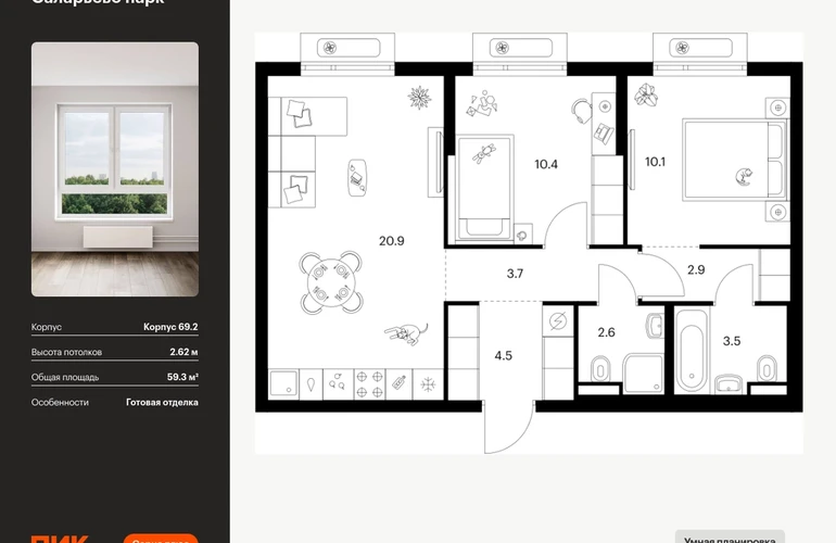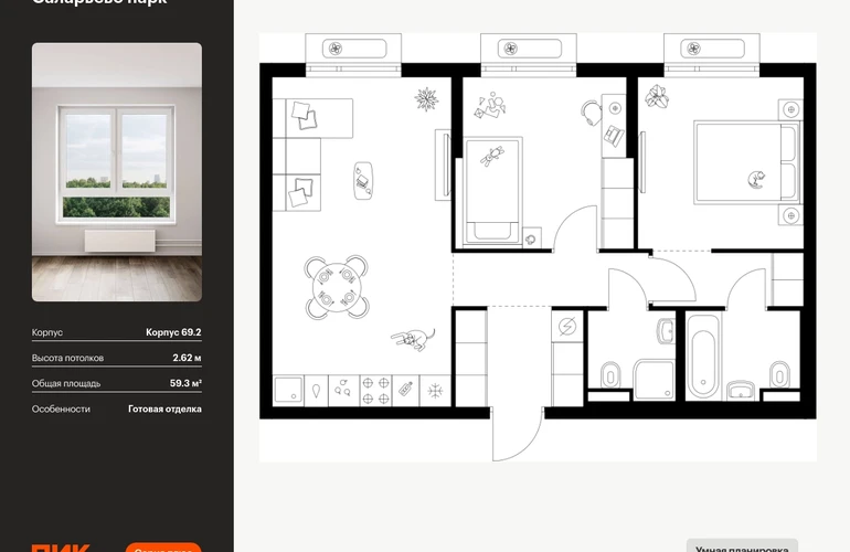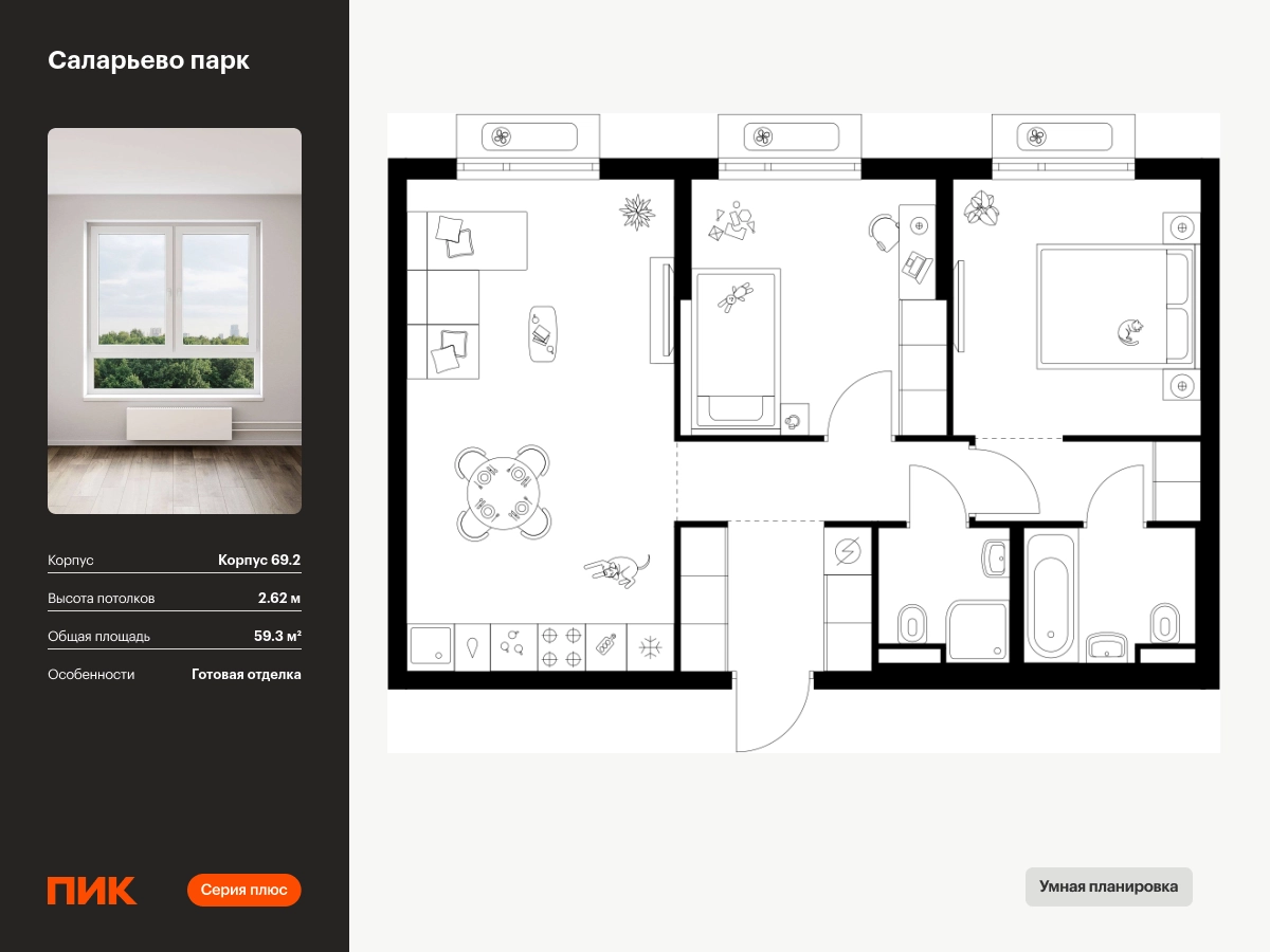 Продаётся 2-комн.квартира площадью 59.30 кв.м на 2 этаже 14 этажного дома (Корпус 69.2, секция 2) проекта ПИК Саларьево парк. Светлый просторный подъезд на уровне земли, функциональная планировка, большие окна, с отделкой. Жилой район «Саларьево парк» расположен в Новой Москве, в четырёх километрах от МКАД по Киевскому шоссе. Две станции метро: «Саларьево» и «Филатов луг» — находятся в пешей доступности от проекта. Дойти до них можно за 5–10 минут. В квартале уже создана качественная среда, где есть абсолютно всё для полноценной жизни, работы и отдыха. «Саларьево парк» — не просто квартал, а полноценный жилой район, который отличается разноплановой архитектурой. Над концепцией квартала работали несколько ведущих архитектурных бюро, которые стремились добиться разнообразия в фасадных решениях. Ярким примером такого подхода станет корпус 83, который относится к «Серии плюс». Новый корпус 83 был создан по принципам южной архитектуры: расслабленный и лаконичный силуэт зданий, привлекающий к себе внимание. Архитектурная изюминка 83-го корпуса — террасы и фигурные балконы. Вместе с окнами и другими акцентными элементами они создают уникальный облик здания, отсылая нас к изысканной южной архитектуре. Все корпуса в квартале гармонично сочетаются, образуя единую городскую среду. Здесь приятно гулять и проводить время на улице всей семьёй. В «Саларьево парке» создана уникальная образовательная среда, включающая в себя шесть школ, рассчитанных на 6 250 учеников. Две из них уже открыты, их посещает 2 300 детей. Также на территории «Саларьево парка» находится 12 детских садов, один из которых с бассейном. Сейчас уже открыты 7 садов. В «Саларьево парке» открыта уникальная игровая площадка — PlayHub «Оригами». Здесь есть ручей, горка-труба и рельефные холмы. Взрослые смогут отдохнуть в уютном кафе, пока дети играют. Также на территории проекта есть SportHub — большая спортивная зона, разделённая по интересам и возрастам. Здесь можно заниматься разными видами спорта: футболом, баскетболом, волейболом и стритболом. Зимой центральную часть площадки превращают в каток. Во дворах-парках жилого квартала есть места для отдыха, детские и спортивные площадки. На первых этажах домов расположены магазины, кафе и полезные сервисы. Также вблизи проекта есть несколько масштабных торговых центров. До ТЦ «Саларис» пять минут пешком, до «Рио», Metro Cash & Carry и «Лемана про» — пять минут на автомобиле. Артикул - 1023438О застройщике