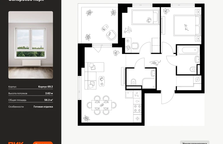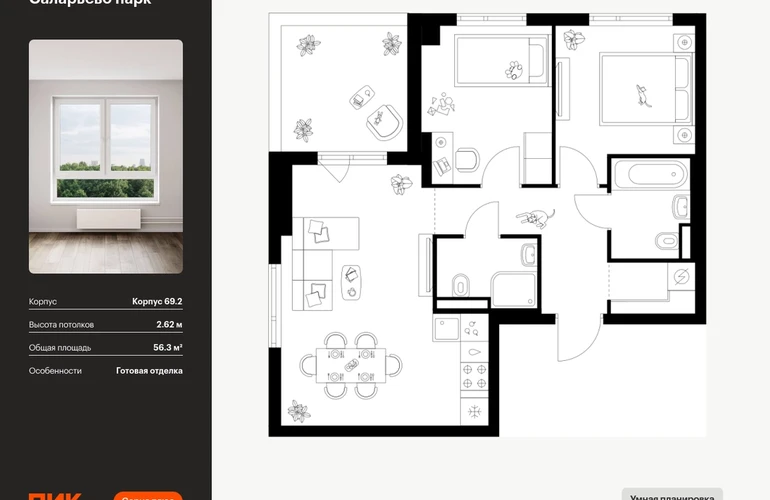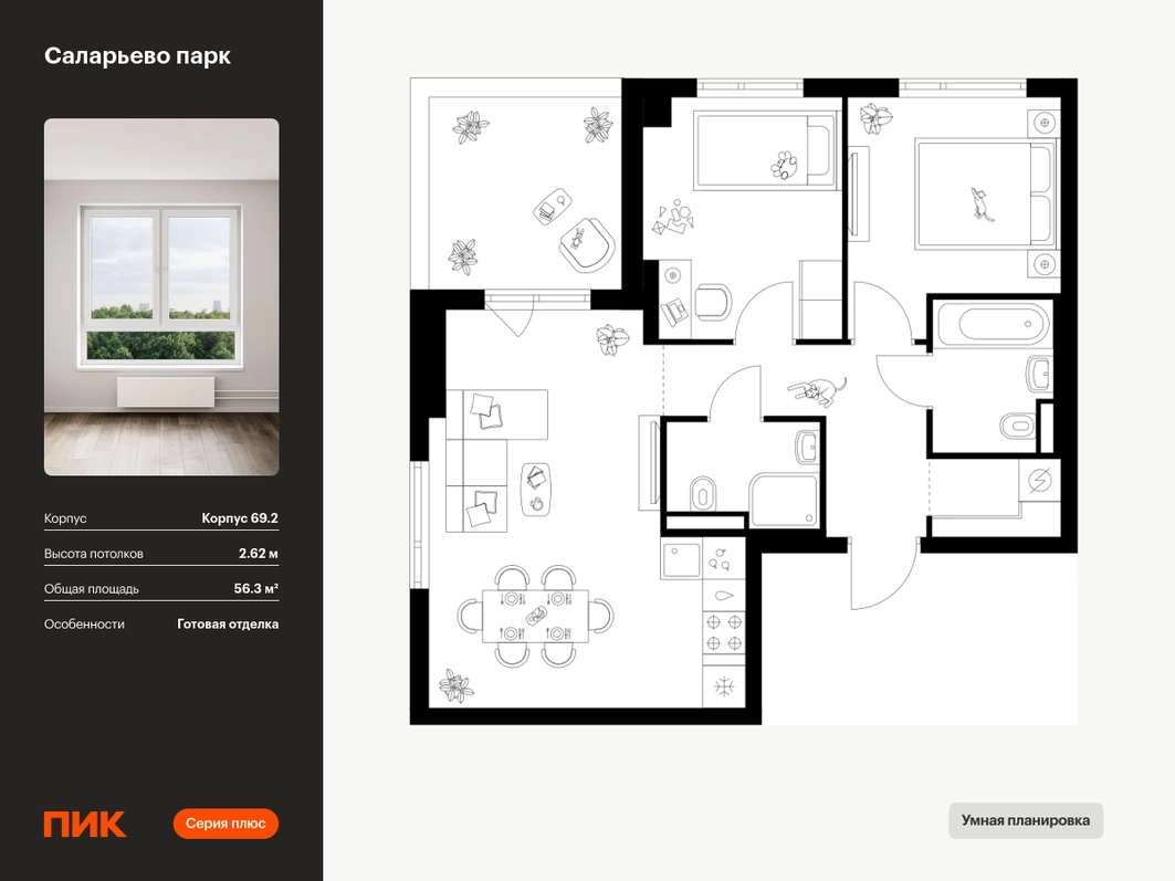 Продаётся 2-комн.квартира площадью 56.30 кв.м на 13 этаже 14 этажного дома (Корпус 69.2, секция 2) проекта ПИК Саларьево парк. Светлый просторный подъезд на уровне земли, функциональная планировка, большие окна, с отделкой. Жилой район «Саларьево парк» расположен в Новой Москве, в четырёх километрах от МКАД по Киевскому шоссе. Две станции метро: «Саларьево» и «Филатов луг» — находятся в пешей доступности от проекта. Дойти до них можно за 5–10 минут. В квартале уже создана качественная среда, где есть абсолютно всё для полноценной жизни, работы и отдыха. «Саларьево парк» — не просто квартал, а полноценный жилой район, который отличается разноплановой архитектурой. Над концепцией квартала работали несколько ведущих архитектурных бюро, которые стремились добиться разнообразия в фасадных решениях. Ярким примером такого подхода станет корпус 83, который относится к «Серии плюс». Новый корпус 83 был создан по принципам южной архитектуры: расслабленный и лаконичный силуэт зданий, привлекающий к себе внимание. Архитектурная изюминка 83-го корпуса — террасы и фигурные балконы. Вместе с окнами и другими акцентными элементами они создают уникальный облик здания, отсылая нас к изысканной южной архитектуре. Все корпуса в квартале гармонично сочетаются, образуя единую городскую среду. Здесь приятно гулять и проводить время на улице всей семьёй. В «Саларьево парке» создана уникальная образовательная среда, включающая в себя шесть школ, рассчитанных на 6 250 учеников. Две из них уже открыты, их посещает 2 300 детей. Также на территории «Саларьево парка» находится 12 детских садов, один из которых с бассейном. Сейчас уже открыты 7 садов. В «Саларьево парке» открыта уникальная игровая площадка — PlayHub «Оригами». Здесь есть ручей, горка-труба и рельефные холмы. Взрослые смогут отдохнуть в уютном кафе, пока дети играют. Также на территории проекта есть SportHub — большая спортивная зона, разделённая по интересам и возрастам. Здесь можно заниматься разными видами спорта: футболом, баскетболом, волейболом и стритболом. Зимой центральную часть площадки превращают в каток. Во дворах-парках жилого квартала есть места для отдыха, детские и спортивные площадки. На первых этажах домов расположены магазины, кафе и полезные сервисы. Также вблизи проекта есть несколько масштабных торговых центров. До ТЦ «Саларис» пять минут пешком, до «Рио», Metro Cash & Carry и «Лемана про» — пять минут на автомобиле. Артикул - 1023557О застройщике