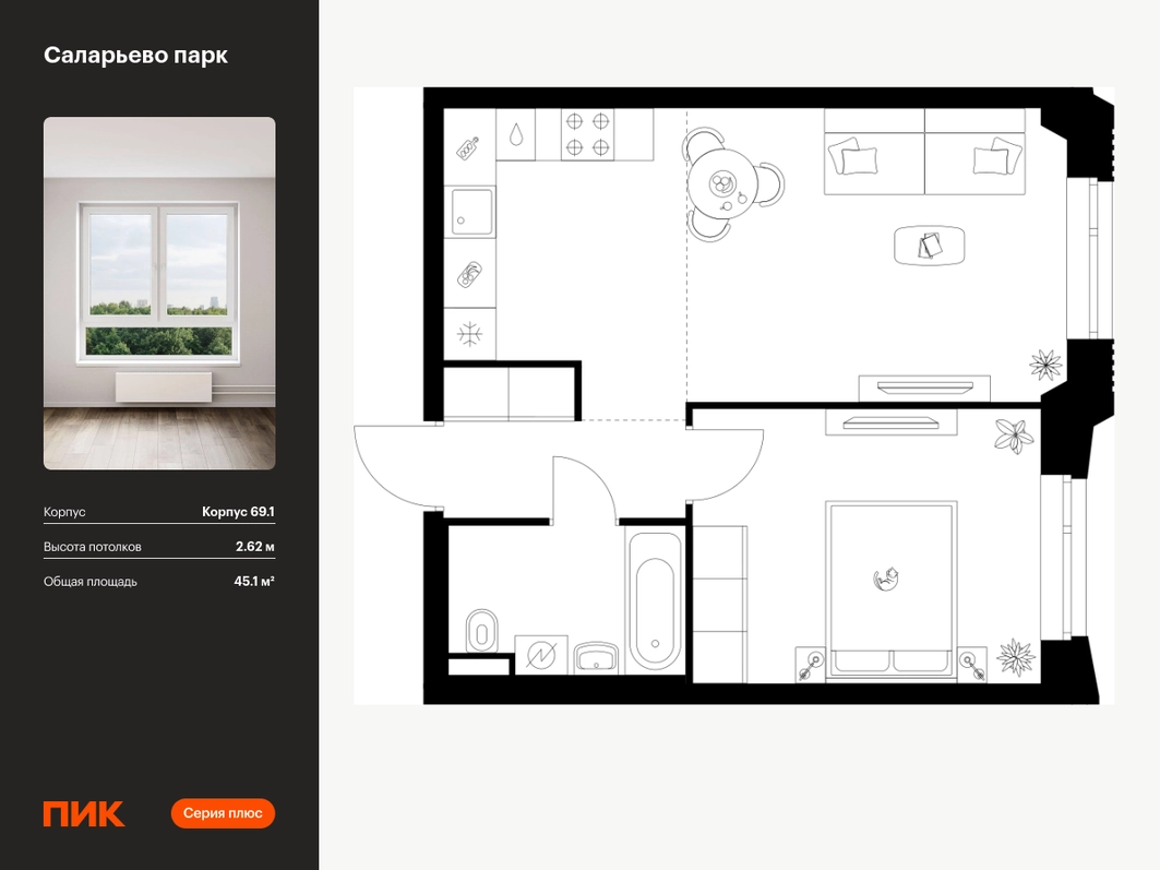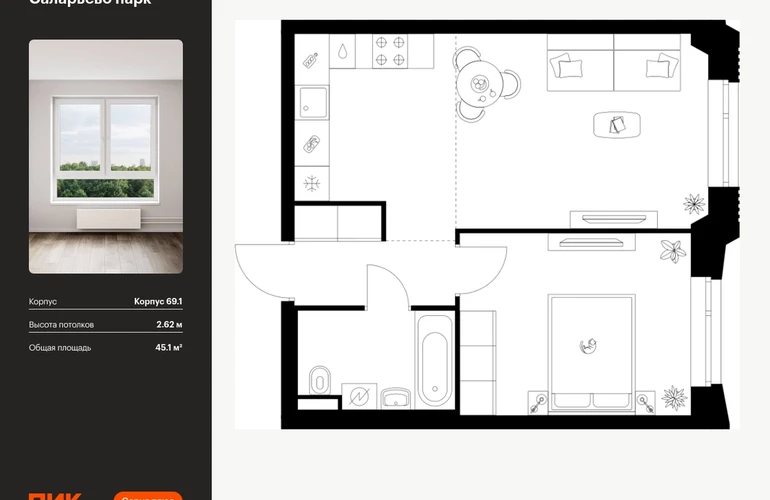 Продаётся 1-комн.квартира площадью 45.10 кв.м на 8 этаже 23 этажного дома (Корпус 69.1, секция 1) проекта ПИК Саларьево парк. Светлый просторный подъезд на уровне земли, функциональная планировка, большие окна, с отделкой. <br> <br>Жилой район «Саларьево парк» расположен в Новой Москве, в четырёх километрах от МКАД по Киевскому шоссе. Две станции метро: «Саларьево» и «Филатов луг» — находятся в пешей доступности от проекта. Дойти до них можно за 5–10 минут. В квартале уже создана качественная среда, где есть абсолютно всё для полноценной жизни, работы и отдыха. <br> <br>«Саларьево парк» — не просто квартал, а полноценный жилой район, который отличается разноплановой архитектурой. Над концепцией квартала работали несколько ведущих архитектурных бюро, которые стремились добиться разнообразия в фасадных решениях. Ярким примером такого подхода станет корпус 83, который относится к «Серии плюс». <br> <br>Новый корпус 83 был создан по принципам южной архитектуры: расслабленный и лаконичный силуэт зданий, привлекающий к себе внимание. Архитектурная изюминка 83-го корпуса — террасы и фигурные балконы. Вместе с окнами и другими акцентными элементами они создают уникальный облик здания, отсылая нас к изысканной южной архитектуре. <br> <br>Все корпуса в квартале гармонично сочетаются, образуя единую городскую среду. Здесь приятно гулять и проводить время на улице всей семьёй. <br> <br>В «Саларьево парке» создана уникальная образовательная среда, включающая в себя шесть школ, рассчитанных на 6 250 учеников. Две из них уже открыты, их посещает 2 300 детей. Также на территории «Саларьево парка» находится 12 детских садов, один из которых с бассейном. Сейчас уже открыты 7 садов. <br> <br>В «Саларьево парке» открыта уникальная игровая площадка — PlayHub «Оригами». Здесь есть ручей, горка-труба и рельефные холмы. Взрослые смогут отдохнуть в уютном кафе, пока дети играют. Также на территории проекта есть SportHub — большая спортивная зона, разделённая по интересам и возрастам. Здесь можно заниматься разными видами спорта: футболом, баскетболом, волейболом и стритболом. Зимой центральную часть площадки превращают в каток. <br> <br>Во дворах-парках жилого квартала есть места для отдыха, детские и спортивные площадки. На первых этажах домов расположены магазины, кафе и полезные сервисы. Также вблизи проекта есть несколько масштабных торговых центров. До ТЦ «Саларис» пять минут пешком, до «Рио», Metro Cash & Carry и «Лемана про» — пять минут на автомобиле. Артикул - 1023255О застройщике