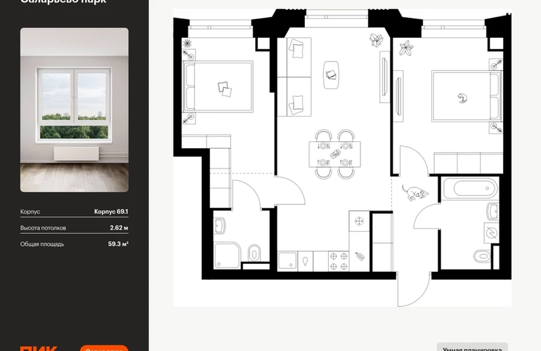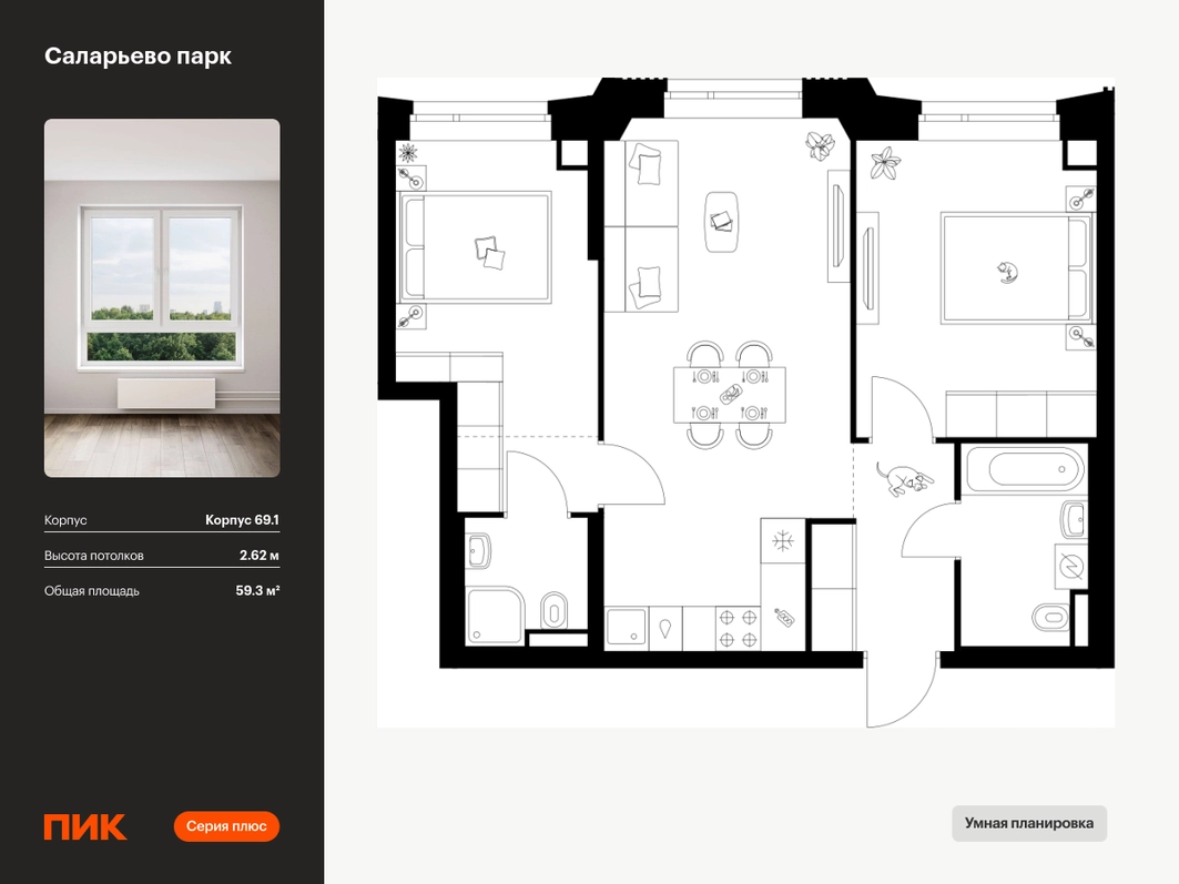 Продаётся 2-комн.квартира площадью 59.30 кв.м на 19 этаже 23 этажного дома (Корпус 69.1, секция 1) проекта ПИК Саларьево парк. Светлый просторный подъезд на уровне земли, функциональная планировка, большие окна, с отделкой. <br> <br>Жилой район «Саларьево парк» расположен в Новой Москве, в четырёх километрах от МКАД по Киевскому шоссе. Две станции метро: «Саларьево» и «Филатов луг» — находятся в пешей доступности от проекта. Дойти до них можно за 5–10 минут. В квартале уже создана качественная среда, где есть абсолютно всё для полноценной жизни, работы и отдыха. <br> <br>«Саларьево парк» — не просто квартал, а полноценный жилой район, который отличается разноплановой архитектурой. Над концепцией квартала работали несколько ведущих архитектурных бюро, которые стремились добиться разнообразия в фасадных решениях. Ярким примером такого подхода станет корпус 83, который относится к «Серии плюс». <br> <br>Новый корпус 83 был создан по принципам южной архитектуры: расслабленный и лаконичный силуэт зданий, привлекающий к себе внимание. Архитектурная изюминка 83-го корпуса — террасы и фигурные балконы. Вместе с окнами и другими акцентными элементами они создают уникальный облик здания, отсылая нас к изысканной южной архитектуре. <br> <br>Все корпуса в квартале гармонично сочетаются, образуя единую городскую среду. Здесь приятно гулять и проводить время на улице всей семьёй. <br> <br>В «Саларьево парке» создана уникальная образовательная среда, включающая в себя шесть школ, рассчитанных на 6 250 учеников. Две из них уже открыты, их посещает 2 300 детей. Также на территории «Саларьево парка» находится 12 детских садов, один из которых с бассейном. Сейчас уже открыты 7 садов. <br> <br>В «Саларьево парке» открыта уникальная игровая площадка — PlayHub «Оригами». Здесь есть ручей, горка-труба и рельефные холмы. Взрослые смогут отдохнуть в уютном кафе, пока дети играют. Также на территории проекта есть SportHub — большая спортивная зона, разделённая по интересам и возрастам. Здесь можно заниматься разными видами спорта: футболом, баскетболом, волейболом и стритболом. Зимой центральную часть площадки превращают в каток. <br> <br>Во дворах-парках жилого квартала есть места для отдыха, детские и спортивные площадки. На первых этажах домов расположены магазины, кафе и полезные сервисы. Также вблизи проекта есть несколько масштабных торговых центров. До ТЦ «Саларис» пять минут пешком, до «Рио», Metro Cash & Carry и «Лемана про» — пять минут на автомобиле. Артикул - 1023399О застройщике