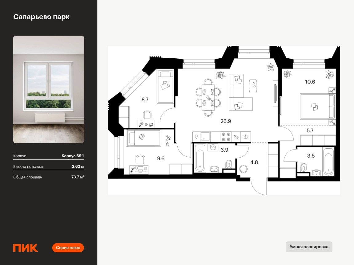 Продаётся 3-комн.квартира площадью 73.70 кв.м на 11 этаже 23 этажного дома (Корпус 69.1, секция 1) проекта ПИК Саларьево парк. Светлый просторный подъезд на уровне земли, функциональная планировка, большие окна, с отделкой. <br> <br>Жилой район «Саларьево парк» расположен в Новой Москве, в четырёх километрах от МКАД по Киевскому шоссе. Две станции метро: «Саларьево» и «Филатов луг» — находятся в пешей доступности от проекта. Дойти до них можно за 5–10 минут. В квартале уже создана качественная среда, где есть абсолютно всё для полноценной жизни, работы и отдыха. <br> <br>«Саларьево парк» — не просто квартал, а полноценный жилой район, который отличается разноплановой архитектурой. Над концепцией квартала работали несколько ведущих архитектурных бюро, которые стремились добиться разнообразия в фасадных решениях. Ярким примером такого подхода станет корпус 83, который относится к «Серии плюс». <br> <br>Новый корпус 83 был создан по принципам южной архитектуры: расслабленный и лаконичный силуэт зданий, привлекающий к себе внимание. Архитектурная изюминка 83-го корпуса — террасы и фигурные балконы. Вместе с окнами и другими акцентными элементами они создают уникальный облик здания, отсылая нас к изысканной южной архитектуре. <br> <br>Все корпуса в квартале гармонично сочетаются, образуя единую городскую среду. Здесь приятно гулять и проводить время на улице всей семьёй. <br> <br>В «Саларьево парке» создана уникальная образовательная среда, включающая в себя шесть школ, рассчитанных на 6 250 учеников. Две из них уже открыты, их посещает 2 300 детей. Также на территории «Саларьево парка» находится 12 детских садов, один из которых с бассейном. Сейчас уже открыты 7 садов. <br> <br>В «Саларьево парке» открыта уникальная игровая площадка — PlayHub «Оригами». Здесь есть ручей, горка-труба и рельефные холмы. Взрослые смогут отдохнуть в уютном кафе, пока дети играют. Также на территории проекта есть SportHub — большая спортивная зона, разделённая по интересам и возрастам. Здесь можно заниматься разными видами спорта: футболом, баскетболом, волейболом и стритболом. Зимой центральную часть площадки превращают в каток. <br> <br>Во дворах-парках жилого квартала есть места для отдыха, детские и спортивные площадки. На первых этажах домов расположены магазины, кафе и полезные сервисы. Также вблизи проекта есть несколько масштабных торговых центров. До ТЦ «Саларис» пять минут пешком, до «Рио», Metro Cash & Carry и «Лемана про» — пять минут на автомобиле. Артикул - 1023304О застройщике