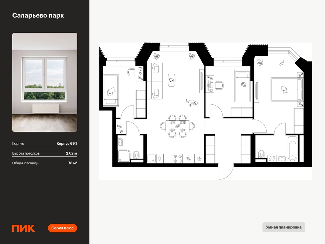 Продаётся 3-комн.квартира площадью 78.00 кв.м на 23 этаже 23 этажного дома (Корпус 69.1, секция 1) проекта ПИК Саларьево парк. Светлый просторный подъезд на уровне земли, функциональная планировка, большие окна, с отделкой. <br> <br>Жилой район «Саларьево парк» расположен в Новой Москве, в четырёх километрах от МКАД по Киевскому шоссе. Две станции метро: «Саларьево» и «Филатов луг» — находятся в пешей доступности от проекта. Дойти до них можно за 5–10 минут. В квартале уже создана качественная среда, где есть абсолютно всё для полноценной жизни, работы и отдыха. <br> <br>«Саларьево парк» — не просто квартал, а полноценный жилой район, который отличается разноплановой архитектурой. Над концепцией квартала работали несколько ведущих архитектурных бюро, которые стремились добиться разнообразия в фасадных решениях. Ярким примером такого подхода станет корпус 83, который относится к «Серии плюс». <br> <br>Новый корпус 83 был создан по принципам южной архитектуры: расслабленный и лаконичный силуэт зданий, привлекающий к себе внимание. Архитектурная изюминка 83-го корпуса — террасы и фигурные балконы. Вместе с окнами и другими акцентными элементами они создают уникальный облик здания, отсылая нас к изысканной южной архитектуре. <br> <br>Все корпуса в квартале гармонично сочетаются, образуя единую городскую среду. Здесь приятно гулять и проводить время на улице всей семьёй. <br> <br>В «Саларьево парке» создана уникальная образовательная среда, включающая в себя шесть школ, рассчитанных на 6 250 учеников. Две из них уже открыты, их посещает 2 300 детей. Также на территории «Саларьево парка» находится 12 детских садов, один из которых с бассейном. Сейчас уже открыты 7 садов. <br> <br>В «Саларьево парке» открыта уникальная игровая площадка — PlayHub «Оригами». Здесь есть ручей, горка-труба и рельефные холмы. Взрослые смогут отдохнуть в уютном кафе, пока дети играют. Также на территории проекта есть SportHub — большая спортивная зона, разделённая по интересам и возрастам. Здесь можно заниматься разными видами спорта: футболом, баскетболом, волейболом и стритболом. Зимой центральную часть площадки превращают в каток. <br> <br>Во дворах-парках жилого квартала есть места для отдыха, детские и спортивные площадки. На первых этажах домов расположены магазины, кафе и полезные сервисы. Также вблизи проекта есть несколько масштабных торговых центров. До ТЦ «Саларис» пять минут пешком, до «Рио», Metro Cash & Carry и «Леруа Мерлен» — пять минут на автомобиле. Артикул - 1023429О застройщике