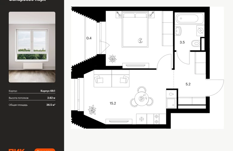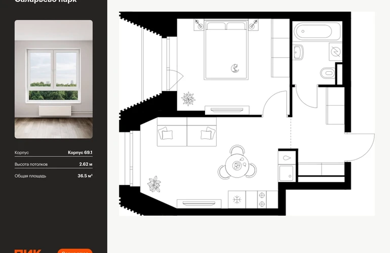 Продаётся 1-комн.квартира площадью 36.50 кв.м на 20 этаже 23 этажного дома (Корпус 69.1, секция 1) проекта ПИК Саларьево парк. Светлый просторный подъезд на уровне земли, функциональная планировка, большие окна, с отделкой. Артикул - 1023414О застройщике