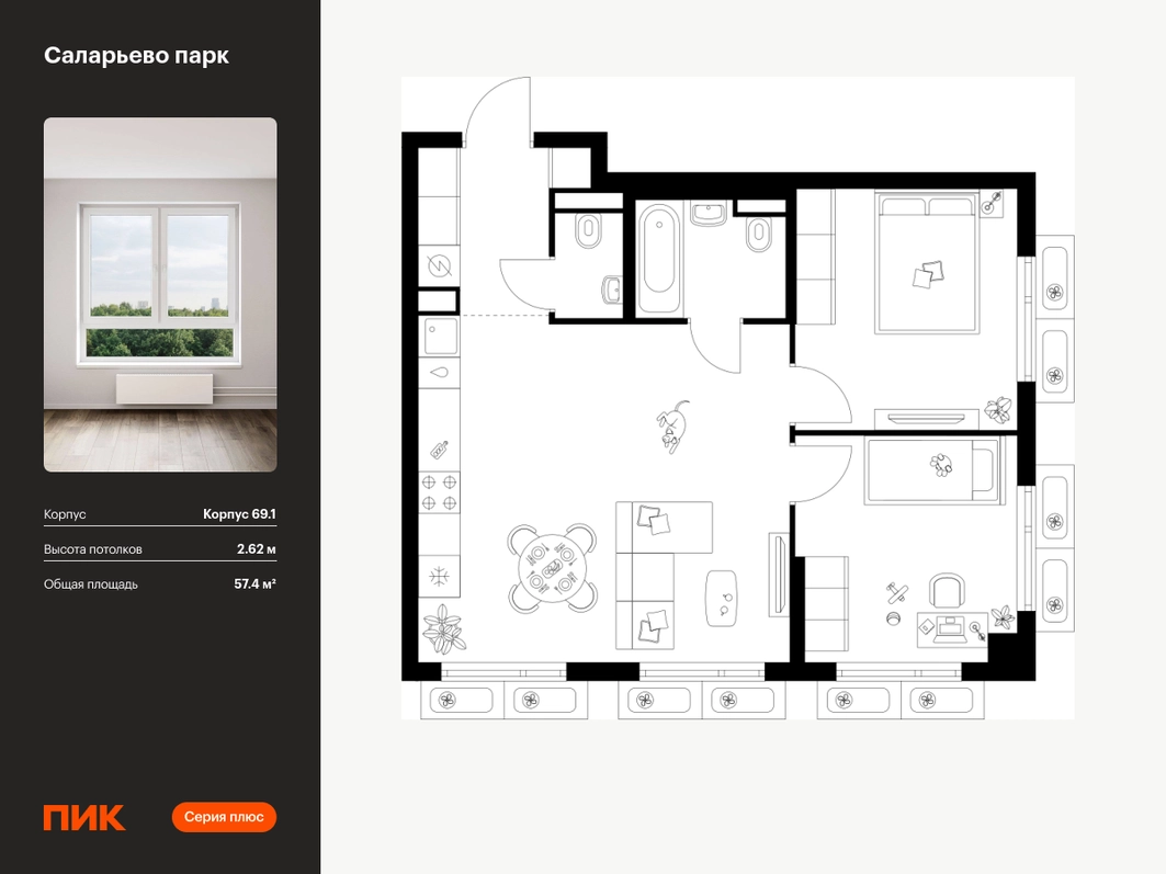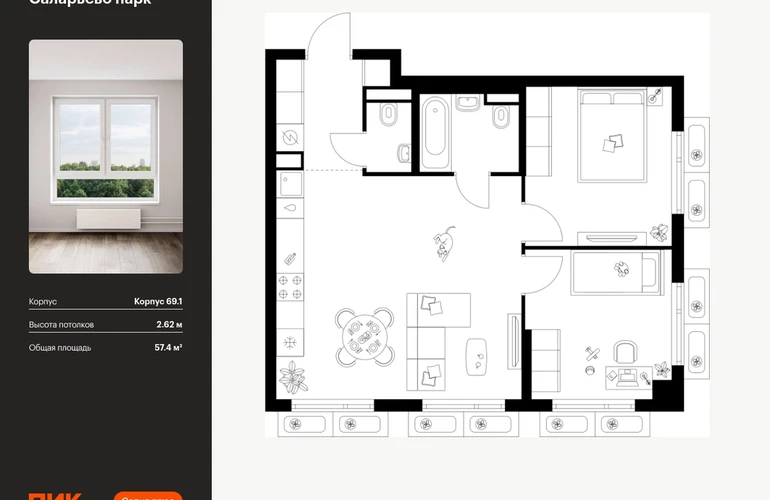 Продаётся 2-комн.квартира площадью 57.40 кв.м на 13 этаже 23 этажного дома (Корпус 69.1, секция 1) проекта ПИК Саларьево парк. Светлый просторный подъезд на уровне земли, функциональная планировка, большие окна, с отделкой. Жилой район «Саларьево парк» расположен в Новой Москве, в четырёх километрах от МКАД по Киевскому шоссе. Две станции метро: «Саларьево» и «Филатов луг», — находятся в пешей доступности от проекта. Дойти до них можно за 5–10 минут. В квартале уже создана качественная среда, где есть абсолютно всё для полноценной жизни, работы и отдыха. «Саларьево парк» — не просто квартал, а полноценный жилой район, который отличается разноплановой архитектурой. Над концепцией квартала работали несколько ведущих архитектурных бюро, которые стремились добиться разнообразия в фасадных решениях. Ярким примером такого подхода станут корпуса 82 и 83, которые относятся к «Серии плюс». Новый корпус 83 был создан по принципам южной архитектуры: расслабленный и лаконичный силуэт зданий, привлекающий к себе внимание. Архитектурная изюминка 83-го корпуса — террасы и фигурные балконы. Вместе с окнами и другими акцентными элементами они создают уникальный облик здания, отсылая нас к изысканной южной архитектуре. Все корпуса в квартале гармонично сочетаются, образуя единую городскую среду. Здесь приятно гулять и проводить время на улице всей семьёй. В «Саларьево парке» создана уникальная образовательная среда, включающая в себя шесть школ, рассчитанных на 6 250 учеников. Четыре из них уже открыты, их посещает 2 300 детей. Также на территории «Саларьево парка» находится 12 детских садов, один из которых с бассейном. Сейчас уже открыты 8 садов. В «Саларьево парке» открыта уникальная игровая площадка — PlayHub «Оригами». Здесь есть ручей, горка-труба и рельефные холмы. Взрослые смогут отдохнуть в уютном кафе, пока дети играют. Также на территории проекта есть SportHub — большая спортивная зона, разделённая по интересам и возрастам. Здесь можно заниматься разными видами спорта: футболом, баскетболом, волейболом и стритболом. Зимой центральную часть площадки превращают в каток. Во дворах-парках жилого квартала есть места для отдыха, детские и спортивные площадки. На первых этажах домов расположены магазины, кафе и полезные сервисы. Также вблизи проекта есть несколько масштабных торговых центров. До ТЦ «Саларис» пять минут пешком, до «Рио», Metro Cash & Carry и «Леруа Мерлен» — пять минут на автомобиле. Артикул - 1023325О застройщике