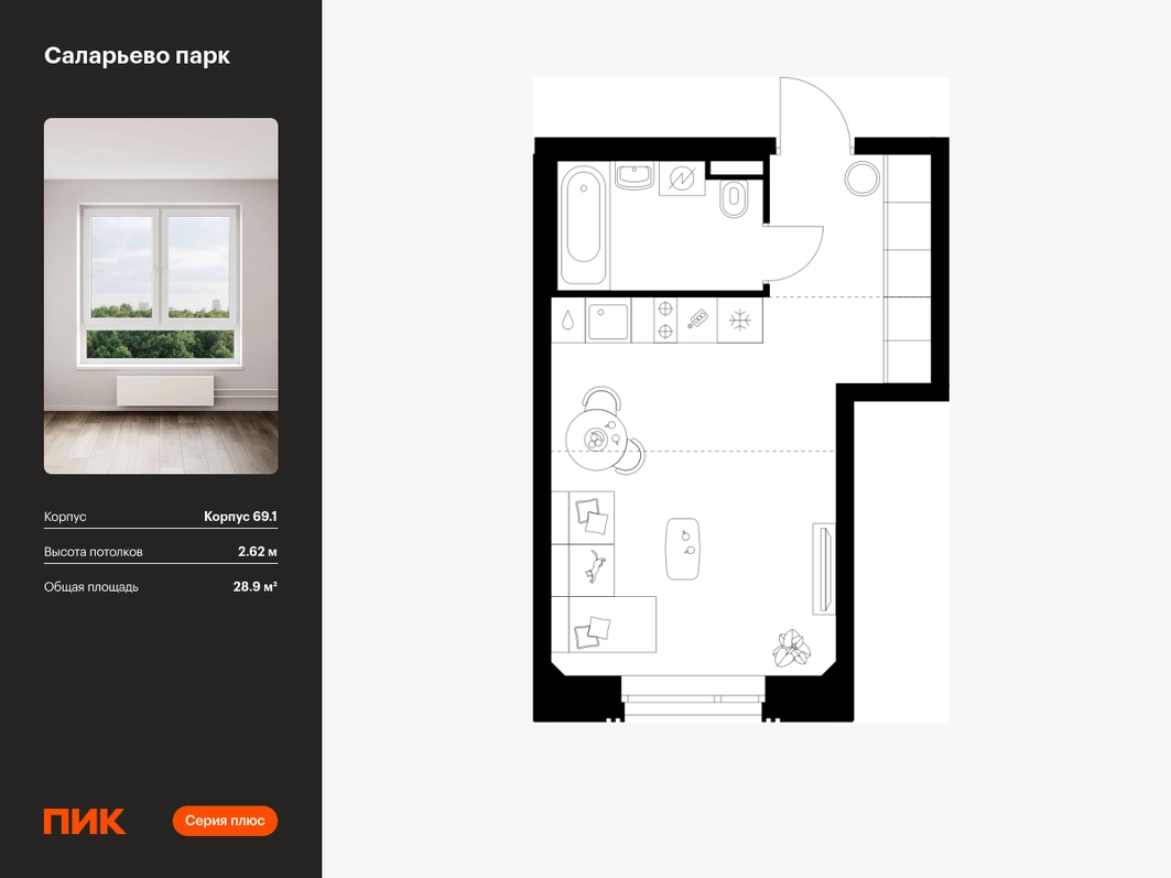 Продаётся квартира-студия площадью 28.90 кв.м на 19 этаже 23 этажного дома (Корпус 69.1, секция 1) проекта ПИК Саларьево парк. Светлый просторный подъезд на уровне земли, функциональная планировка, большие окна, с отделкой. Жилой район «Саларьево парк» расположен в Новой Москве, в четырёх километрах от МКАД по Киевскому шоссе. Две станции метро: «Саларьево» и «Филатов луг» — находятся в пешей доступности от проекта. Дойти до них можно за 5–10 минут. В квартале уже создана качественная среда, где есть абсолютно всё для полноценной жизни, работы и отдыха. «Саларьево парк» — не просто квартал, а полноценный жилой район, который отличается разноплановой архитектурой. Над концепцией квартала работали несколько ведущих архитектурных бюро, которые стремились добиться разнообразия в фасадных решениях. Ярким примером такого подхода станет корпус 83, который относится к «Серии плюс». Новый корпус 83 был создан по принципам южной архитектуры: расслабленный и лаконичный силуэт зданий, привлекающий к себе внимание. Архитектурная изюминка 83-го корпуса — террасы и фигурные балконы. Вместе с окнами и другими акцентными элементами они создают уникальный облик здания, отсылая нас к изысканной южной архитектуре. Все корпуса в квартале гармонично сочетаются, образуя единую городскую среду. Здесь приятно гулять и проводить время на улице всей семьёй. В «Саларьево парке» создана уникальная образовательная среда, включающая в себя шесть школ, рассчитанных на 6 250 учеников. Две из них уже открыты, их посещает 2 300 детей. Также на территории «Саларьево парка» находится 12 детских садов, один из которых с бассейном. Сейчас уже открыты 7 садов. В «Саларьево парке» открыта уникальная игровая площадка — PlayHub «Оригами». Здесь есть ручей, горка-труба и рельефные холмы. Взрослые смогут отдохнуть в уютном кафе, пока дети играют. Также на территории проекта есть SportHub — большая спортивная зона, разделённая по интересам и возрастам. Здесь можно заниматься разными видами спорта: футболом, баскетболом, волейболом и стритболом. Зимой центральную часть площадки превращают в каток. Во дворах-парках жилого квартала есть места для отдыха, детские и спортивные площадки. На первых этажах домов расположены магазины, кафе и полезные сервисы. Также вблизи проекта есть несколько масштабных торговых центров. До ТЦ «Саларис» пять минут пешком, до «Рио», Metro Cash & Carry и «Лемана про» — пять минут на автомобиле. Артикул - 1023408О застройщике