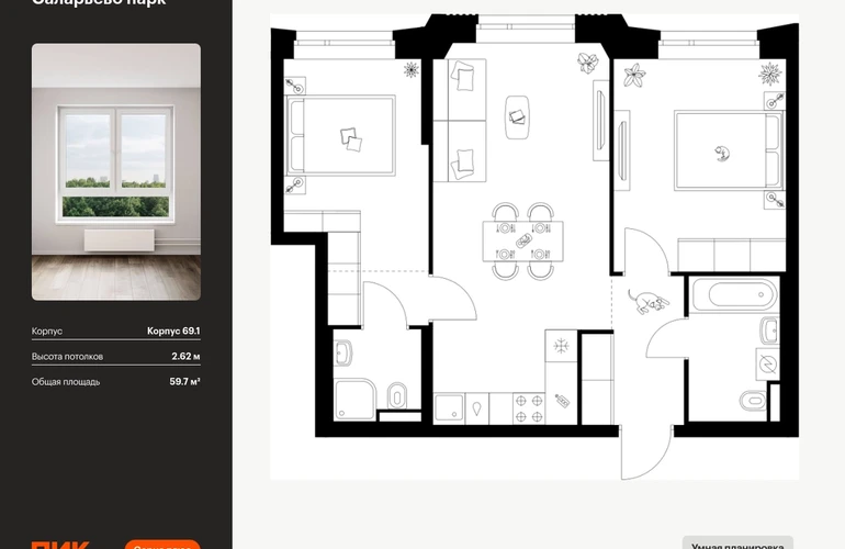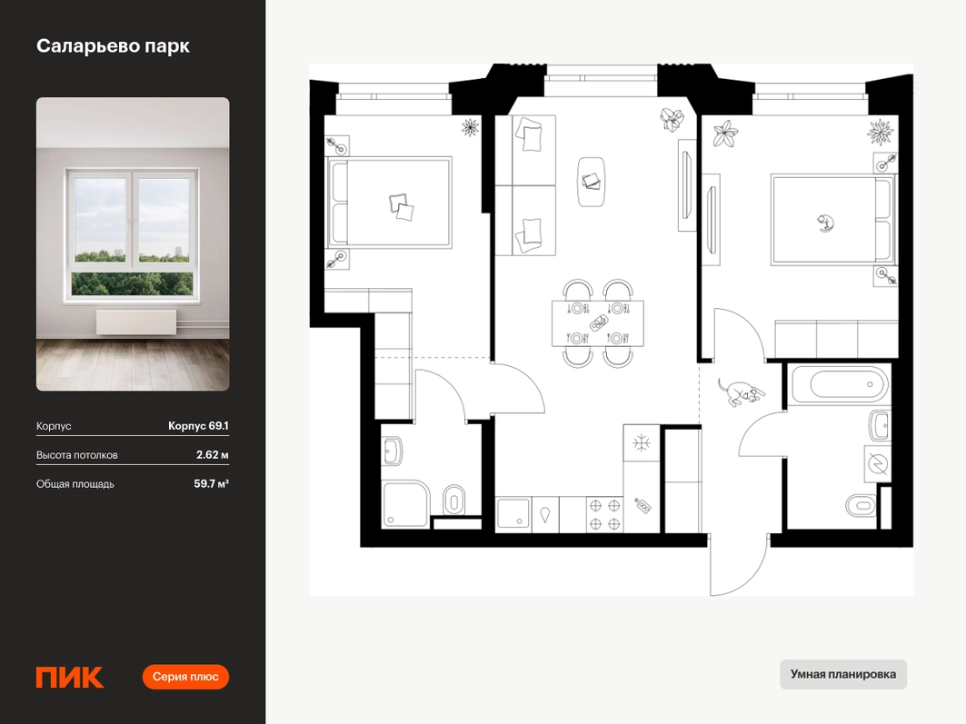 Продаётся 2-комн.квартира площадью 59.70 кв.м на 14 этаже 23 этажного дома (Корпус 69.1, секция 1) проекта ПИК Саларьево парк. Светлый просторный подъезд на уровне земли, функциональная планировка, большие окна, с отделкой. <br> <br>Жилой район «Саларьево парк» расположен в Новой Москве, в четырёх километрах от МКАД по Киевскому шоссе. Две станции метро: «Саларьево» и «Филатов луг» — находятся в пешей доступности от проекта. Дойти до них можно за 5–10 минут. В квартале уже создана качественная среда, где есть абсолютно всё для полноценной жизни, работы и отдыха. <br> <br>«Саларьево парк» — не просто квартал, а полноценный жилой район, который отличается разноплановой архитектурой. Над концепцией квартала работали несколько ведущих архитектурных бюро, которые стремились добиться разнообразия в фасадных решениях. Ярким примером такого подхода станет корпус 83, который относится к «Серии плюс». <br> <br>Новый корпус 83 был создан по принципам южной архитектуры: расслабленный и лаконичный силуэт зданий, привлекающий к себе внимание. Архитектурная изюминка 83-го корпуса — террасы и фигурные балконы. Вместе с окнами и другими акцентными элементами они создают уникальный облик здания, отсылая нас к изысканной южной архитектуре. <br> <br>Все корпуса в квартале гармонично сочетаются, образуя единую городскую среду. Здесь приятно гулять и проводить время на улице всей семьёй. <br> <br>В «Саларьево парке» создана уникальная образовательная среда, включающая в себя шесть школ, рассчитанных на 6 250 учеников. Две из них уже открыты, их посещает 2 300 детей. Также на территории «Саларьево парка» находится 12 детских садов, один из которых с бассейном. Сейчас уже открыты 7 садов. <br> <br>В «Саларьево парке» открыта уникальная игровая площадка — PlayHub «Оригами». Здесь есть ручей, горка-труба и рельефные холмы. Взрослые смогут отдохнуть в уютном кафе, пока дети играют. Также на территории проекта есть SportHub — большая спортивная зона, разделённая по интересам и возрастам. Здесь можно заниматься разными видами спорта: футболом, баскетболом, волейболом и стритболом. Зимой центральную часть площадки превращают в каток. <br> <br>Во дворах-парках жилого квартала есть места для отдыха, детские и спортивные площадки. На первых этажах домов расположены магазины, кафе и полезные сервисы. Также вблизи проекта есть несколько масштабных торговых центров. До ТЦ «Саларис» пять минут пешком, до «Рио», Metro Cash & Carry и «Лемана про» — пять минут на автомобиле. Артикул - 1023333О застройщике