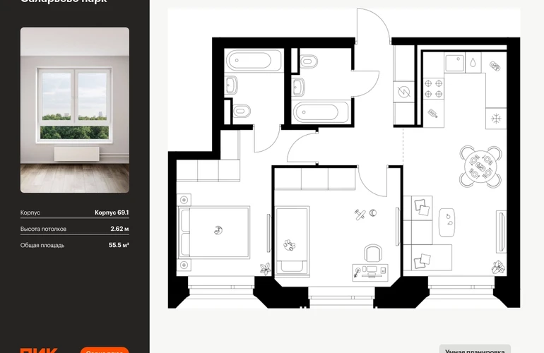 Продаётся 2-комн.квартира площадью 55.50 кв.м на 17 этаже 23 этажного дома (Корпус 69.1, секция 1) проекта ПИК Саларьево парк. Светлый просторный подъезд на уровне земли, функциональная планировка, большие окна, с отделкой. Артикул - 1023380О застройщике