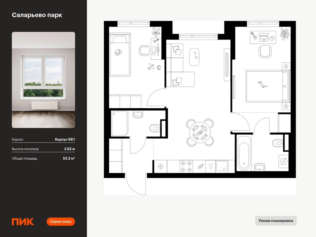 Продаётся 2-комн.квартира площадью 53.20 кв.м на 18 этаже 23 этажного дома (Корпус 69.1, секция 1) проекта ПИК Саларьево парк. Светлый просторный подъезд на уровне земли, функциональная планировка, большие окна, с отделкой. Жилой район «Саларьево парк» расположен в Новой Москве, в четырёх километрах от МКАД по Киевскому шоссе. Две станции метро: «Саларьево» и «Филатов луг» — находятся в пешей доступности от проекта. Дойти до них можно за 5–10 минут. В квартале уже создана качественная среда, где есть абсолютно всё для полноценной жизни, работы и отдыха. «Саларьево парк» — не просто квартал, а полноценный жилой район, который отличается разноплановой архитектурой. Над концепцией квартала работали несколько ведущих архитектурных бюро, которые стремились добиться разнообразия в фасадных решениях. Ярким примером такого подхода станет корпус 83, который относится к «Серии плюс». Новый корпус 83 был создан по принципам южной архитектуры: расслабленный и лаконичный силуэт зданий, привлекающий к себе внимание. Архитектурная изюминка 83-го корпуса — террасы и фигурные балконы. Вместе с окнами и другими акцентными элементами они создают уникальный облик здания, отсылая нас к изысканной южной архитектуре. Все корпуса в квартале гармонично сочетаются, образуя единую городскую среду. Здесь приятно гулять и проводить время на улице всей семьёй. В «Саларьево парке» создана уникальная образовательная среда, включающая в себя шесть школ, рассчитанных на 6 250 учеников. Две из них уже открыты, их посещает 2 300 детей. Также на территории «Саларьево парка» находится 12 детских садов, один из которых с бассейном. Сейчас уже открыты 7 садов. В «Саларьево парке» открыта уникальная игровая площадка — PlayHub «Оригами». Здесь есть ручей, горка-труба и рельефные холмы. Взрослые смогут отдохнуть в уютном кафе, пока дети играют. Также на территории проекта есть SportHub — большая спортивная зона, разделённая по интересам и возрастам. Здесь можно заниматься разными видами спорта: футболом, баскетболом, волейболом и стритболом. Зимой центральную часть площадки превращают в каток. Во дворах-парках жилого квартала есть места для отдыха, детские и спортивные площадки. На первых этажах домов расположены магазины, кафе и полезные сервисы. Также вблизи проекта есть несколько масштабных торговых центров. До ТЦ «Саларис» пять минут пешком, до «Рио», Metro Cash & Carry и «Лемана про» — пять минут на автомобиле. Артикул - 1023387О застройщике