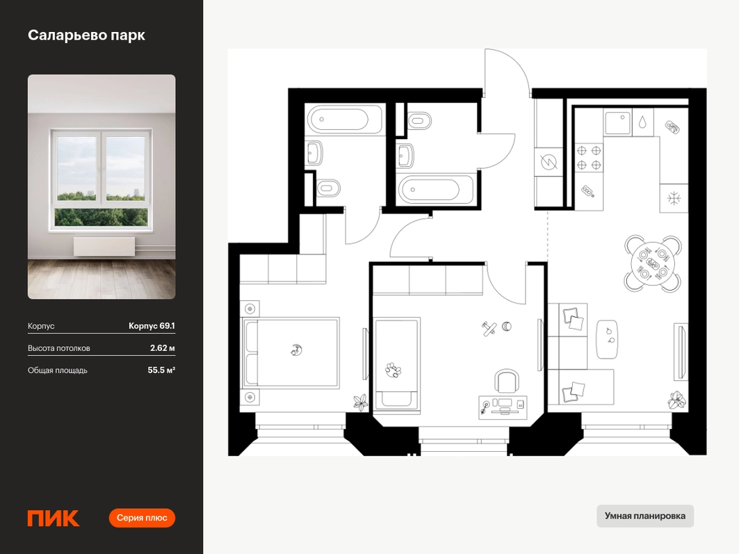 Продаётся 2-комн.квартира площадью 55.50 кв.м на 14 этаже 23 этажного дома (Корпус 69.1, секция 1) проекта ПИК Саларьево парк. Светлый просторный подъезд на уровне земли, функциональная планировка, большие окна, с отделкой. Артикул - 1023341О застройщике