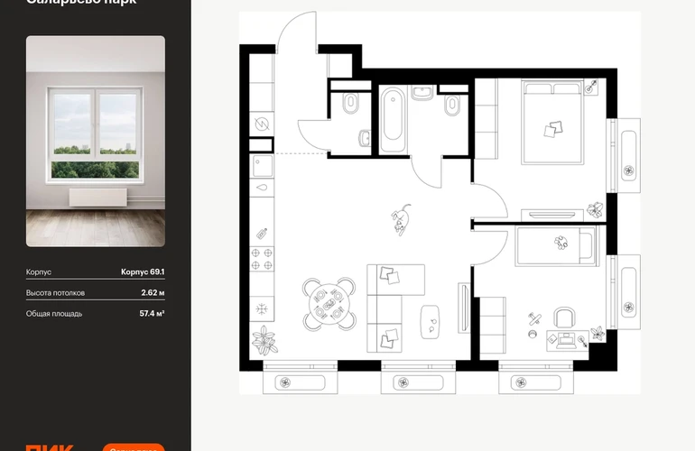Продаётся 2-комн.квартира площадью 57.40 кв.м на 9 этаже 23 этажного дома (Корпус 69.1, секция 1) проекта ПИК Саларьево парк. Светлый просторный подъезд на уровне земли, функциональная планировка, большие окна, с отделкой. <br> <br>Жилой район «Саларьево парк» расположен в Новой Москве, в четырёх километрах от МКАД по Киевскому шоссе. Две станции метро: «Саларьево» и «Филатов луг» — находятся в пешей доступности от проекта. Дойти до них можно за 5–10 минут. В квартале уже создана качественная среда, где есть абсолютно всё для полноценной жизни, работы и отдыха. <br> <br>«Саларьево парк» — не просто квартал, а полноценный жилой район, который отличается разноплановой архитектурой. Над концепцией квартала работали несколько ведущих архитектурных бюро, которые стремились добиться разнообразия в фасадных решениях. Ярким примером такого подхода станет корпус 83, который относится к «Серии плюс». <br> <br>Новый корпус 83 был создан по принципам южной архитектуры: расслабленный и лаконичный силуэт зданий, привлекающий к себе внимание. Архитектурная изюминка 83-го корпуса — террасы и фигурные балконы. Вместе с окнами и другими акцентными элементами они создают уникальный облик здания, отсылая нас к изысканной южной архитектуре. <br> <br>Все корпуса в квартале гармонично сочетаются, образуя единую городскую среду. Здесь приятно гулять и проводить время на улице всей семьёй. <br> <br>В «Саларьево парке» создана уникальная образовательная среда, включающая в себя шесть школ, рассчитанных на 6 250 учеников. Две из них уже открыты, их посещает 2 300 детей. Также на территории «Саларьево парка» находится 12 детских садов, один из которых с бассейном. Сейчас уже открыты 7 садов. <br> <br>В «Саларьево парке» открыта уникальная игровая площадка — PlayHub «Оригами». Здесь есть ручей, горка-труба и рельефные холмы. Взрослые смогут отдохнуть в уютном кафе, пока дети играют. Также на территории проекта есть SportHub — большая спортивная зона, разделённая по интересам и возрастам. Здесь можно заниматься разными видами спорта: футболом, баскетболом, волейболом и стритболом. Зимой центральную часть площадки превращают в каток. <br> <br>Во дворах-парках жилого квартала есть места для отдыха, детские и спортивные площадки. На первых этажах домов расположены магазины, кафе и полезные сервисы. Также вблизи проекта есть несколько масштабных торговых центров. До ТЦ «Саларис» пять минут пешком, до «Рио», Metro Cash & Carry и «Лемана про» — пять минут на автомобиле. Артикул - 1023274О застройщике