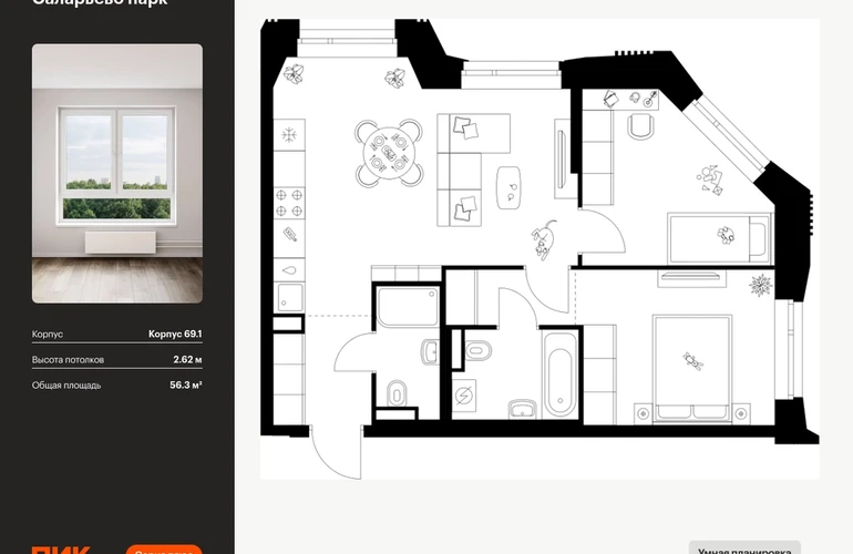 Продаётся 2-комн.квартира площадью 56.30 кв.м на 14 этаже 23 этажного дома (Корпус 69.1, секция 1) проекта ПИК Саларьево парк. Светлый просторный подъезд на уровне земли, функциональная планировка, большие окна, с отделкой. Жилой район «Саларьево парк» расположен в Новой Москве, в четырёх километрах от МКАД по Киевскому шоссе. Две станции метро: «Саларьево» и «Филатов луг», — находятся в пешей доступности от проекта. Дойти до них можно за 5–10 минут. В квартале уже создана качественная среда, где есть абсолютно всё для полноценной жизни, работы и отдыха. «Саларьево парк» — не просто квартал, а полноценный жилой район, который отличается разноплановой архитектурой. Над концепцией квартала работали несколько ведущих архитектурных бюро, которые стремились добиться разнообразия в фасадных решениях. Ярким примером такого подхода станут корпуса 82 и 83, которые относятся к «Серии плюс». Новый корпус 83 был создан по принципам южной архитектуры: расслабленный и лаконичный силуэт зданий, привлекающий к себе внимание. Архитектурная изюминка 83-го корпуса — террасы и фигурные балконы. Вместе с окнами и другими акцентными элементами они создают уникальный облик здания, отсылая нас к изысканной южной архитектуре. Все корпуса в квартале гармонично сочетаются, образуя единую городскую среду. Здесь приятно гулять и проводить время на улице всей семьёй. В «Саларьево парке» создана уникальная образовательная среда, включающая в себя шесть школ, рассчитанных на 6 250 учеников. Четыре из них уже открыты, их посещает 2 300 детей. Также на территории «Саларьево парка» находится 12 детских садов, один из которых с бассейном. Сейчас уже открыты 8 садов. В «Саларьево парке» открыта уникальная игровая площадка — PlayHub «Оригами». Здесь есть ручей, горка-труба и рельефные холмы. Взрослые смогут отдохнуть в уютном кафе, пока дети играют. Также на территории проекта есть SportHub — большая спортивная зона, разделённая по интересам и возрастам. Здесь можно заниматься разными видами спорта: футболом, баскетболом, волейболом и стритболом. Зимой центральную часть площадки превращают в каток. Во дворах-парках жилого квартала есть места для отдыха, детские и спортивные площадки. На первых этажах домов расположены магазины, кафе и полезные сервисы. Также вблизи проекта есть несколько масштабных торговых центров. До ТЦ «Саларис» пять минут пешком, до «Рио», Metro Cash & Carry и «Леруа Мерлен» — пять минут на автомобиле. Артикул - 1023331О застройщике