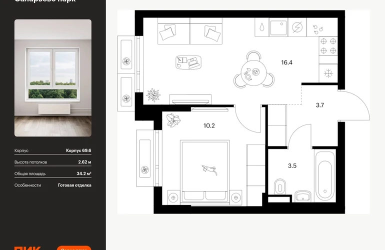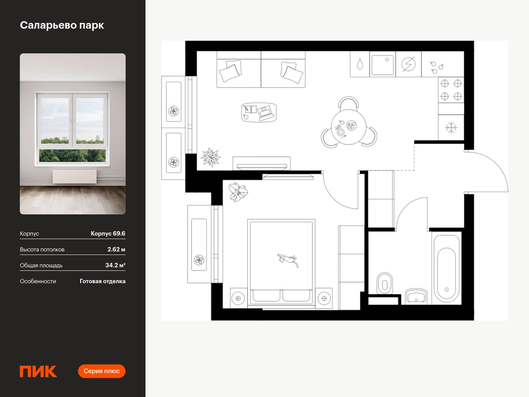 Продаётся 1-комн.квартира площадью 34.20 кв.м на 5 этаже 14 этажного дома (Корпус 69.6, секция 6) проекта ПИК Саларьево парк. Светлый просторный подъезд на уровне земли, функциональная планировка, большие окна, с отделкой. Жилой район «Саларьево парк» расположен в Новой Москве, в четырёх километрах от МКАД по Киевскому шоссе. Две станции метро: «Саларьево» и «Филатов луг» — находятся в пешей доступности от проекта. Дойти до них можно за 5–10 минут. В квартале уже создана качественная среда, где есть абсолютно всё для полноценной жизни, работы и отдыха. «Саларьево парк» — не просто квартал, а полноценный жилой район, который отличается разноплановой архитектурой. Над концепцией квартала работали несколько ведущих архитектурных бюро, которые стремились добиться разнообразия в фасадных решениях. Ярким примером такого подхода станет корпус 83, который относится к «Серии плюс». Новый корпус 83 был создан по принципам южной архитектуры: расслабленный и лаконичный силуэт зданий, привлекающий к себе внимание. Архитектурная изюминка 83-го корпуса — террасы и фигурные балконы. Вместе с окнами и другими акцентными элементами они создают уникальный облик здания, отсылая нас к изысканной южной архитектуре. Все корпуса в квартале гармонично сочетаются, образуя единую городскую среду. Здесь приятно гулять и проводить время на улице всей семьёй. В «Саларьево парке» создана уникальная образовательная среда, включающая в себя шесть школ, рассчитанных на 6 250 учеников. Две из них уже открыты, их посещает 2 300 детей. Также на территории «Саларьево парка» находится 12 детских садов, один из которых с бассейном. Сейчас уже открыты 7 садов. В «Саларьево парке» открыта уникальная игровая площадка — PlayHub «Оригами». Здесь есть ручей, горка-труба и рельефные холмы. Взрослые смогут отдохнуть в уютном кафе, пока дети играют. Также на территории проекта есть SportHub — большая спортивная зона, разделённая по интересам и возрастам. Здесь можно заниматься разными видами спорта: футболом, баскетболом, волейболом и стритболом. Зимой центральную часть площадки превращают в каток. Во дворах-парках жилого квартала есть места для отдыха, детские и спортивные площадки. На первых этажах домов расположены магазины, кафе и полезные сервисы. Также вблизи проекта есть несколько масштабных торговых центров. До ТЦ «Саларис» пять минут пешком, до «Рио», Metro Cash & Carry и «Лемана про» — пять минут на автомобиле. Артикул - 1024032О застройщике