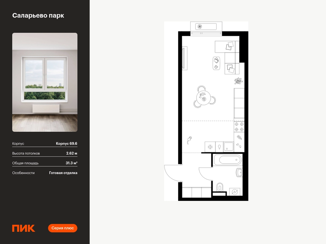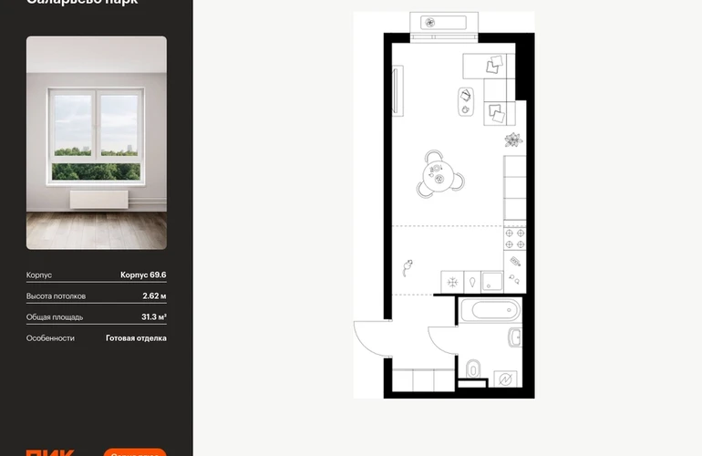 Продаётся квартира-студия площадью 31.30 кв.м на 4 этаже 14 этажного дома (Корпус 69.6, секция 6) проекта ПИК Саларьево парк. Светлый просторный подъезд на уровне земли, функциональная планировка, большие окна, с отделкой. Жилой район «Саларьево парк» расположен в Новой Москве, в четырёх километрах от МКАД по Киевскому шоссе. Две станции метро: «Саларьево» и «Филатов луг», — находятся в пешей доступности от проекта. Дойти до них можно за 5–10 минут. В квартале уже создана качественная среда, где есть абсолютно всё для полноценной жизни, работы и отдыха. «Саларьево парк» — не просто квартал, а полноценный жилой район, который отличается разноплановой архитектурой. Над концепцией квартала работали несколько ведущих архитектурных бюро, которые стремились добиться разнообразия в фасадных решениях. Ярким примером такого подхода станут корпуса 82 и 83, которые относятся к «Серии плюс». Новый корпус 83 был создан по принципам южной архитектуры: расслабленный и лаконичный силуэт зданий, привлекающий к себе внимание. Архитектурная изюминка 83-го корпуса — террасы и фигурные балконы. Вместе с окнами и другими акцентными элементами они создают уникальный облик здания, отсылая нас к изысканной южной архитектуре. Все корпуса в квартале гармонично сочетаются, образуя единую городскую среду. Здесь приятно гулять и проводить время на улице всей семьёй. В «Саларьево парке» создана уникальная образовательная среда, включающая в себя шесть школ, рассчитанных на 6 250 учеников. Четыре из них уже открыты, их посещает 2 300 детей. Также на территории «Саларьево парка» находится 12 детских садов, один из которых с бассейном. Сейчас уже открыты 8 садов. В «Саларьево парке» открыта уникальная игровая площадка — PlayHub «Оригами». Здесь есть ручей, горка-труба и рельефные холмы. Взрослые смогут отдохнуть в уютном кафе, пока дети играют. Также на территории проекта есть SportHub — большая спортивная зона, разделённая по интересам и возрастам. Здесь можно заниматься разными видами спорта: футболом, баскетболом, волейболом и стритболом. Зимой центральную часть площадки превращают в каток. Во дворах-парках жилого квартала есть места для отдыха, детские и спортивные площадки. На первых этажах домов расположены магазины, кафе и полезные сервисы. Также вблизи проекта есть несколько масштабных торговых центров. До ТЦ «Саларис» пять минут пешком, до «Рио», Metro Cash & Carry и «Леруа Мерлен» — пять минут на автомобиле. Артикул - 1024031О застройщике