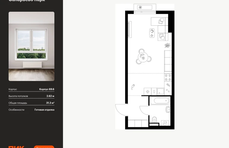 Продаётся квартира-студия площадью 31.30 кв.м на 10 этаже 14 этажного дома (Корпус 69.6, секция 6) проекта ПИК Саларьево парк. Светлый просторный подъезд на уровне земли, функциональная планировка, большие окна, с отделкой. Жилой район «Саларьево парк» расположен в Новой Москве, в четырёх километрах от МКАД по Киевскому шоссе. Две станции метро: «Саларьево» и «Филатов луг», — находятся в пешей доступности от проекта. Дойти до них можно за 5–10 минут. В квартале уже создана качественная среда, где есть абсолютно всё для полноценной жизни, работы и отдыха. «Саларьево парк» — не просто квартал, а полноценный жилой район, который отличается разноплановой архитектурой. Над концепцией квартала работали несколько ведущих архитектурных бюро, которые стремились добиться разнообразия в фасадных решениях. Ярким примером такого подхода станут корпуса 82 и 83, которые относятся к «Серии плюс». Новый корпус 83 был создан по принципам южной архитектуры: расслабленный и лаконичный силуэт зданий, привлекающий к себе внимание. Архитектурная изюминка 83-го корпуса — террасы и фигурные балконы. Вместе с окнами и другими акцентными элементами они создают уникальный облик здания, отсылая нас к изысканной южной архитектуре. Все корпуса в квартале гармонично сочетаются, образуя единую городскую среду. Здесь приятно гулять и проводить время на улице всей семьёй. В «Саларьево парке» создана уникальная образовательная среда, включающая в себя шесть школ, рассчитанных на 6 250 учеников. Четыре из них уже открыты, их посещает 2 300 детей. Также на территории «Саларьево парка» находится 12 детских садов, один из которых с бассейном. Сейчас уже открыты 8 садов. В «Саларьево парке» открыта уникальная игровая площадка — PlayHub «Оригами». Здесь есть ручей, горка-труба и рельефные холмы. Взрослые смогут отдохнуть в уютном кафе, пока дети играют. Также на территории проекта есть SportHub — большая спортивная зона, разделённая по интересам и возрастам. Здесь можно заниматься разными видами спорта: футболом, баскетболом, волейболом и стритболом. Зимой центральную часть площадки превращают в каток. Во дворах-парках жилого квартала есть места для отдыха, детские и спортивные площадки. На первых этажах домов расположены магазины, кафе и полезные сервисы. Также вблизи проекта есть несколько масштабных торговых центров. До ТЦ «Саларис» пять минут пешком, до «Рио», Metro Cash & Carry и «Леруа Мерлен» — пять минут на автомобиле. Артикул - 1024065О застройщике