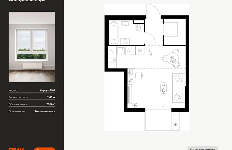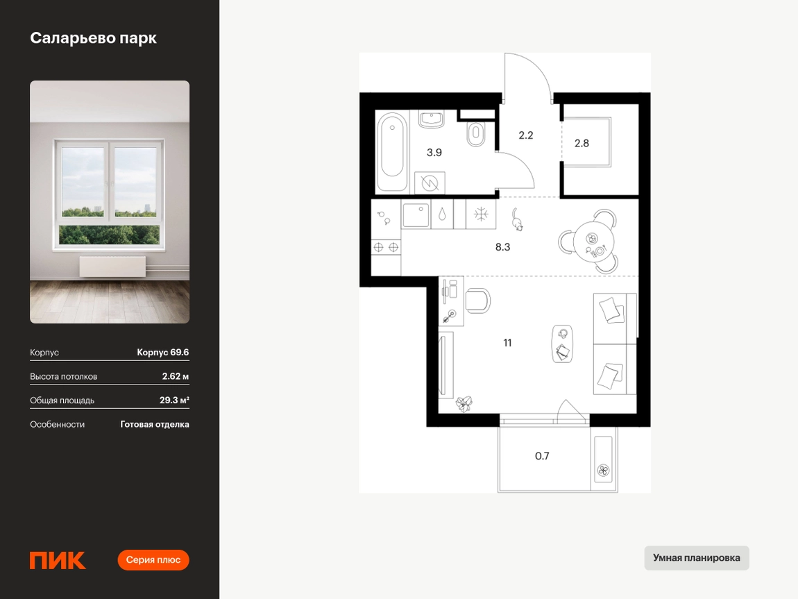 Продаётся квартира-студия площадью 29.30 кв.м на 3 этаже 14 этажного дома (Корпус 69.6, секция 6) проекта ПИК Саларьево парк. Светлый просторный подъезд на уровне земли, функциональная планировка, большие окна, с отделкой. Жилой район «Саларьево парк» расположен в Новой Москве, в четырёх километрах от МКАД по Киевскому шоссе. Две станции метро: «Саларьево» и «Филатов луг» — находятся в пешей доступности от проекта. Дойти до них можно за 5–10 минут. В квартале уже создана качественная среда, где есть абсолютно всё для полноценной жизни, работы и отдыха. «Саларьево парк» — не просто квартал, а полноценный жилой район, который отличается разноплановой архитектурой. Над концепцией квартала работали несколько ведущих архитектурных бюро, которые стремились добиться разнообразия в фасадных решениях. Ярким примером такого подхода станет корпус 83, который относится к «Серии плюс». Новый корпус 83 был создан по принципам южной архитектуры: расслабленный и лаконичный силуэт зданий, привлекающий к себе внимание. Архитектурная изюминка 83-го корпуса — террасы и фигурные балконы. Вместе с окнами и другими акцентными элементами они создают уникальный облик здания, отсылая нас к изысканной южной архитектуре. Все корпуса в квартале гармонично сочетаются, образуя единую городскую среду. Здесь приятно гулять и проводить время на улице всей семьёй. В «Саларьево парке» создана уникальная образовательная среда, включающая в себя шесть школ, рассчитанных на 6 250 учеников. Две из них уже открыты, их посещает 2 300 детей. Также на территории «Саларьево парка» находится 12 детских садов, один из которых с бассейном. Сейчас уже открыты 7 садов. В «Саларьево парке» открыта уникальная игровая площадка — PlayHub «Оригами». Здесь есть ручей, горка-труба и рельефные холмы. Взрослые смогут отдохнуть в уютном кафе, пока дети играют. Также на территории проекта есть SportHub — большая спортивная зона, разделённая по интересам и возрастам. Здесь можно заниматься разными видами спорта: футболом, баскетболом, волейболом и стритболом. Зимой центральную часть площадки превращают в каток. Во дворах-парках жилого квартала есть места для отдыха, детские и спортивные площадки. На первых этажах домов расположены магазины, кафе и полезные сервисы. Также вблизи проекта есть несколько масштабных торговых центров. До ТЦ «Саларис» пять минут пешком, до «Рио», Metro Cash & Carry и «Лемана про» — пять минут на автомобиле. Артикул - 1024021О застройщике