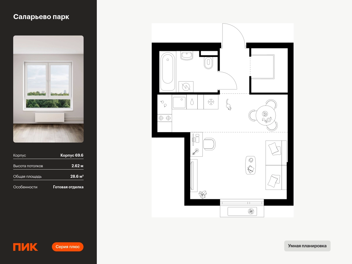Продаётся квартира-студия площадью 28.60 кв.м на 7 этаже 14 этажного дома (Корпус 69.6, секция 6) проекта ПИК Саларьево парк. Светлый просторный подъезд на уровне земли, функциональная планировка, большие окна, с отделкой. <br> <br>Жилой район «Саларьево парк» расположен в Новой Москве, в четырёх километрах от МКАД по Киевскому шоссе. Две станции метро: «Саларьево» и «Филатов луг» — находятся в пешей доступности от проекта. Дойти до них можно за 5–10 минут. В квартале уже создана качественная среда, где есть абсолютно всё для полноценной жизни, работы и отдыха. <br> <br>«Саларьево парк» — не просто квартал, а полноценный жилой район, который отличается разноплановой архитектурой. Над концепцией квартала работали несколько ведущих архитектурных бюро, которые стремились добиться разнообразия в фасадных решениях. Ярким примером такого подхода станет корпус 83, который относится к «Серии плюс». <br> <br>Новый корпус 83 был создан по принципам южной архитектуры: расслабленный и лаконичный силуэт зданий, привлекающий к себе внимание. Архитектурная изюминка 83-го корпуса — террасы и фигурные балконы. Вместе с окнами и другими акцентными элементами они создают уникальный облик здания, отсылая нас к изысканной южной архитектуре. <br> <br>Все корпуса в квартале гармонично сочетаются, образуя единую городскую среду. Здесь приятно гулять и проводить время на улице всей семьёй. <br> <br>В «Саларьево парке» создана уникальная образовательная среда, включающая в себя шесть школ, рассчитанных на 6 250 учеников. Две из них уже открыты, их посещает 2 300 детей. Также на территории «Саларьево парка» находится 12 детских садов, один из которых с бассейном. Сейчас уже открыты 7 садов. <br> <br>В «Саларьево парке» открыта уникальная игровая площадка — PlayHub «Оригами». Здесь есть ручей, горка-труба и рельефные холмы. Взрослые смогут отдохнуть в уютном кафе, пока дети играют. Также на территории проекта есть SportHub — большая спортивная зона, разделённая по интересам и возрастам. Здесь можно заниматься разными видами спорта: футболом, баскетболом, волейболом и стритболом. Зимой центральную часть площадки превращают в каток. <br> <br>Во дворах-парках жилого квартала есть места для отдыха, детские и спортивные площадки. На первых этажах домов расположены магазины, кафе и полезные сервисы. Также вблизи проекта есть несколько масштабных торговых центров. До ТЦ «Саларис» пять минут пешком, до «Рио», Metro Cash & Carry и «Леруа Мерлен» — пять минут на автомобиле. Артикул - 1024045О застройщике