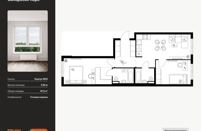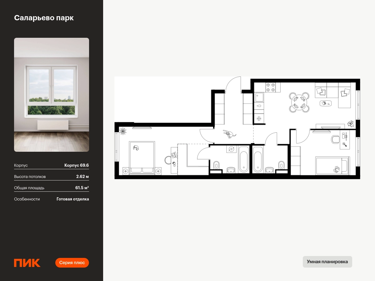 Продаётся 2-комн.квартира площадью 61.50 кв.м на 14 этаже 14 этажного дома (Корпус 69.6, секция 6) проекта ПИК Саларьево парк. Светлый просторный подъезд на уровне земли, функциональная планировка, большие окна, с отделкой. Жилой район «Саларьево парк» расположен в Новой Москве, в четырёх километрах от МКАД по Киевскому шоссе. Две станции метро: «Саларьево» и «Филатов луг», — находятся в пешей доступности от проекта. Дойти до них можно за 5–10 минут. В квартале уже создана качественная среда, где есть абсолютно всё для полноценной жизни, работы и отдыха. «Саларьево парк» — не просто квартал, а полноценный жилой район, который отличается разноплановой архитектурой. Над концепцией квартала работали несколько ведущих архитектурных бюро, которые стремились добиться разнообразия в фасадных решениях. Ярким примером такого подхода станут корпуса 82 и 83, которые относятся к «Серии плюс». Новый корпус 83 был создан по принципам южной архитектуры: расслабленный и лаконичный силуэт зданий, привлекающий к себе внимание. Архитектурная изюминка 83-го корпуса — террасы и фигурные балконы. Вместе с окнами и другими акцентными элементами они создают уникальный облик здания, отсылая нас к изысканной южной архитектуре. Все корпуса в квартале гармонично сочетаются, образуя единую городскую среду. Здесь приятно гулять и проводить время на улице всей семьёй. В «Саларьево парке» создана уникальная образовательная среда, включающая в себя шесть школ, рассчитанных на 6 250 учеников. Четыре из них уже открыты, их посещает 2 300 детей. Также на территории «Саларьево парка» находится 12 детских садов, один из которых с бассейном. Сейчас уже открыты 8 садов. В «Саларьево парке» открыта уникальная игровая площадка — PlayHub «Оригами». Здесь есть ручей, горка-труба и рельефные холмы. Взрослые смогут отдохнуть в уютном кафе, пока дети играют. Также на территории проекта есть SportHub — большая спортивная зона, разделённая по интересам и возрастам. Здесь можно заниматься разными видами спорта: футболом, баскетболом, волейболом и стритболом. Зимой центральную часть площадки превращают в каток. Во дворах-парках жилого квартала есть места для отдыха, детские и спортивные площадки. На первых этажах домов расположены магазины, кафе и полезные сервисы. Также вблизи проекта есть несколько масштабных торговых центров. До ТЦ «Саларис» пять минут пешком, до «Рио», Metro Cash & Carry и «Леруа Мерлен» — пять минут на автомобиле. Артикул - 1024084О застройщике
