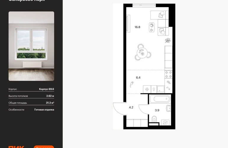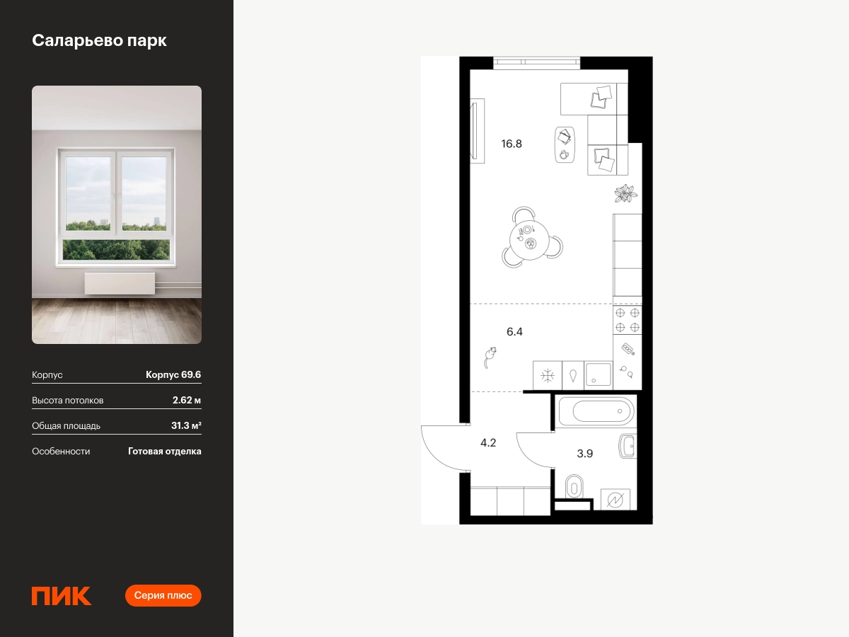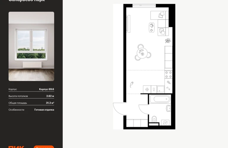 Продаётся квартира-студия площадью 31.30 кв.м на 14 этаже 14 этажного дома (Корпус 69.6, секция 6) проекта ПИК Саларьево парк. Светлый просторный подъезд на уровне земли, функциональная планировка, большие окна, с отделкой. Жилой район «Саларьево парк» расположен в Новой Москве, в четырёх километрах от МКАД по Киевскому шоссе. Две станции метро: «Саларьево» и «Филатов луг», — находятся в пешей доступности от проекта. Дойти до них можно за 5–10 минут. В квартале уже создана качественная среда, где есть абсолютно всё для полноценной жизни, работы и отдыха. «Саларьево парк» — не просто квартал, а полноценный жилой район, который отличается разноплановой архитектурой. Над концепцией квартала работали несколько ведущих архитектурных бюро, которые стремились добиться разнообразия в фасадных решениях. Ярким примером такого подхода станут корпуса 82 и 83, которые относятся к «Серии плюс». Новый корпус 83 был создан по принципам южной архитектуры: расслабленный и лаконичный силуэт зданий, привлекающий к себе внимание. Архитектурная изюминка 83-го корпуса — террасы и фигурные балконы. Вместе с окнами и другими акцентными элементами они создают уникальный облик здания, отсылая нас к изысканной южной архитектуре. Все корпуса в квартале гармонично сочетаются, образуя единую городскую среду. Здесь приятно гулять и проводить время на улице всей семьёй. В «Саларьево парке» создана уникальная образовательная среда, включающая в себя шесть школ, рассчитанных на 6 250 учеников. Четыре из них уже открыты, их посещает 2 300 детей. Также на территории «Саларьево парка» находится 12 детских садов, один из которых с бассейном. Сейчас уже открыты 8 садов. В «Саларьево парке» открыта уникальная игровая площадка — PlayHub «Оригами». Здесь есть ручей, горка-труба и рельефные холмы. Взрослые смогут отдохнуть в уютном кафе, пока дети играют. Также на территории проекта есть SportHub — большая спортивная зона, разделённая по интересам и возрастам. Здесь можно заниматься разными видами спорта: футболом, баскетболом, волейболом и стритболом. Зимой центральную часть площадки превращают в каток. Во дворах-парках жилого квартала есть места для отдыха, детские и спортивные площадки. На первых этажах домов расположены магазины, кафе и полезные сервисы. Также вблизи проекта есть несколько масштабных торговых центров. До ТЦ «Саларис» пять минут пешком, до «Рио», Metro Cash & Carry и «Леруа Мерлен» — пять минут на автомобиле. Артикул - 1024090О застройщике