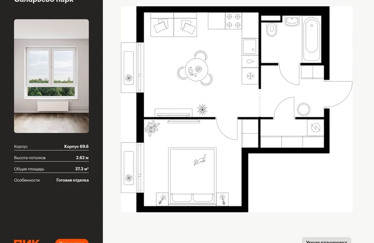 Продаётся 1-комн.квартира площадью 37.30 кв.м на 12 этаже 14 этажного дома (Корпус 69.6, секция 6) проекта ПИК Саларьево парк. Светлый просторный подъезд на уровне земли, функциональная планировка, большие окна, с отделкой. Жилой район «Саларьево парк» расположен в Новой Москве, в четырёх километрах от МКАД по Киевскому шоссе. Две станции метро: «Саларьево» и «Филатов луг» — находятся в пешей доступности от проекта. Дойти до них можно за 5–10 минут. В квартале уже создана качественная среда, где есть абсолютно всё для полноценной жизни, работы и отдыха. «Саларьево парк» — не просто квартал, а полноценный жилой район, который отличается разноплановой архитектурой. Над концепцией квартала работали несколько ведущих архитектурных бюро, которые стремились добиться разнообразия в фасадных решениях. Ярким примером такого подхода станет корпус 83, который относится к «Серии плюс». Новый корпус 83 был создан по принципам южной архитектуры: расслабленный и лаконичный силуэт зданий, привлекающий к себе внимание. Архитектурная изюминка 83-го корпуса — террасы и фигурные балконы. Вместе с окнами и другими акцентными элементами они создают уникальный облик здания, отсылая нас к изысканной южной архитектуре. Все корпуса в квартале гармонично сочетаются, образуя единую городскую среду. Здесь приятно гулять и проводить время на улице всей семьёй. В «Саларьево парке» создана уникальная образовательная среда, включающая в себя шесть школ, рассчитанных на 6 250 учеников. Две из них уже открыты, их посещает 2 300 детей. Также на территории «Саларьево парка» находится 12 детских садов, один из которых с бассейном. Сейчас уже открыты 7 садов. В «Саларьево парке» открыта уникальная игровая площадка — PlayHub «Оригами». Здесь есть ручей, горка-труба и рельефные холмы. Взрослые смогут отдохнуть в уютном кафе, пока дети играют. Также на территории проекта есть SportHub — большая спортивная зона, разделённая по интересам и возрастам. Здесь можно заниматься разными видами спорта: футболом, баскетболом, волейболом и стритболом. Зимой центральную часть площадки превращают в каток. Во дворах-парках жилого квартала есть места для отдыха, детские и спортивные площадки. На первых этажах домов расположены магазины, кафе и полезные сервисы. Также вблизи проекта есть несколько масштабных торговых центров. До ТЦ «Саларис» пять минут пешком, до «Рио», Metro Cash & Carry и «Лемана про» — пять минут на автомобиле. Артикул - 1024077О застройщике