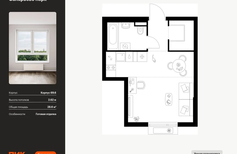 Продаётся квартира-студия площадью 28.60 кв.м на 9 этаже 14 этажного дома (Корпус 69.6, секция 6) проекта ПИК Саларьево парк. Светлый просторный подъезд на уровне земли, функциональная планировка, большие окна, с отделкой. <br> <br>Жилой район «Саларьево парк» расположен в Новой Москве, в четырёх километрах от МКАД по Киевскому шоссе. Две станции метро: «Саларьево» и «Филатов луг» — находятся в пешей доступности от проекта. Дойти до них можно за 5–10 минут. В квартале уже создана качественная среда, где есть абсолютно всё для полноценной жизни, работы и отдыха. <br> <br>«Саларьево парк» — не просто квартал, а полноценный жилой район, который отличается разноплановой архитектурой. Над концепцией квартала работали несколько ведущих архитектурных бюро, которые стремились добиться разнообразия в фасадных решениях. Ярким примером такого подхода станет корпус 83, который относится к «Серии плюс». <br> <br>Новый корпус 83 был создан по принципам южной архитектуры: расслабленный и лаконичный силуэт зданий, привлекающий к себе внимание. Архитектурная изюминка 83-го корпуса — террасы и фигурные балконы. Вместе с окнами и другими акцентными элементами они создают уникальный облик здания, отсылая нас к изысканной южной архитектуре. <br> <br>Все корпуса в квартале гармонично сочетаются, образуя единую городскую среду. Здесь приятно гулять и проводить время на улице всей семьёй. <br> <br>В «Саларьево парке» создана уникальная образовательная среда, включающая в себя шесть школ, рассчитанных на 6 250 учеников. Две из них уже открыты, их посещает 2 300 детей. Также на территории «Саларьево парка» находится 12 детских садов, один из которых с бассейном. Сейчас уже открыты 7 садов. <br> <br>В «Саларьево парке» открыта уникальная игровая площадка — PlayHub «Оригами». Здесь есть ручей, горка-труба и рельефные холмы. Взрослые смогут отдохнуть в уютном кафе, пока дети играют. Также на территории проекта есть SportHub — большая спортивная зона, разделённая по интересам и возрастам. Здесь можно заниматься разными видами спорта: футболом, баскетболом, волейболом и стритболом. Зимой центральную часть площадки превращают в каток. <br> <br>Во дворах-парках жилого квартала есть места для отдыха, детские и спортивные площадки. На первых этажах домов расположены магазины, кафе и полезные сервисы. Также вблизи проекта есть несколько масштабных торговых центров. До ТЦ «Саларис» пять минут пешком, до «Рио», Metro Cash & Carry и «Лемана про» — пять минут на автомобиле. Артикул - 1024057О застройщике