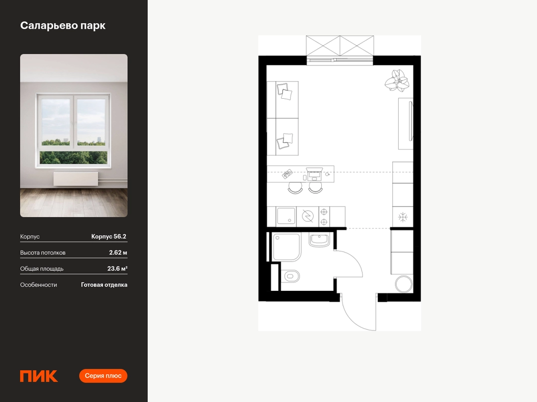 Продаётся квартира-студия площадью 23.60 кв.м на 13 этаже 22 этажного дома (Корпус 56.2 , секция 3) проекта ПИК Саларьево парк. Светлый просторный подъезд на уровне земли, функциональная планировка, большие окна, с отделкой. <br> <br>Жилой район «Саларьево парк» расположен в Новой Москве, в четырёх километрах от МКАД по Киевскому шоссе. Две станции метро: «Саларьево» и «Филатов луг» — находятся в пешей доступности от проекта. Дойти до них можно за 5–10 минут. В квартале уже создана качественная среда, где есть абсолютно всё для полноценной жизни, работы и отдыха. <br> <br>«Саларьево парк» — не просто квартал, а полноценный жилой район, который отличается разноплановой архитектурой. Над концепцией квартала работали несколько ведущих архитектурных бюро, которые стремились добиться разнообразия в фасадных решениях. Ярким примером такого подхода станет корпус 83, который относится к «Серии плюс». <br> <br>Новый корпус 83 был создан по принципам южной архитектуры: расслабленный и лаконичный силуэт зданий, привлекающий к себе внимание. Архитектурная изюминка 83-го корпуса — террасы и фигурные балконы. Вместе с окнами и другими акцентными элементами они создают уникальный облик здания, отсылая нас к изысканной южной архитектуре. <br> <br>Все корпуса в квартале гармонично сочетаются, образуя единую городскую среду. Здесь приятно гулять и проводить время на улице всей семьёй. <br> <br>В «Саларьево парке» создана уникальная образовательная среда, включающая в себя шесть школ, рассчитанных на 6 250 учеников. Две из них уже открыты, их посещает 2 300 детей. Также на территории «Саларьево парка» находится 12 детских садов, один из которых с бассейном. Сейчас уже открыты 7 садов. <br> <br>В «Саларьево парке» открыта уникальная игровая площадка — PlayHub «Оригами». Здесь есть ручей, горка-труба и рельефные холмы. Взрослые смогут отдохнуть в уютном кафе, пока дети играют. Также на территории проекта есть SportHub — большая спортивная зона, разделённая по интересам и возрастам. Здесь можно заниматься разными видами спорта: футболом, баскетболом, волейболом и стритболом. Зимой центральную часть площадки превращают в каток. <br> <br>Во дворах-парках жилого квартала есть места для отдыха, детские и спортивные площадки. На первых этажах домов расположены магазины, кафе и полезные сервисы. Также вблизи проекта есть несколько масштабных торговых центров. До ТЦ «Саларис» пять минут пешком, до «Рио», Metro Cash & Carry и «Леруа Мерлен» — пять минут на автомобиле. Артикул - 990525О застройщике