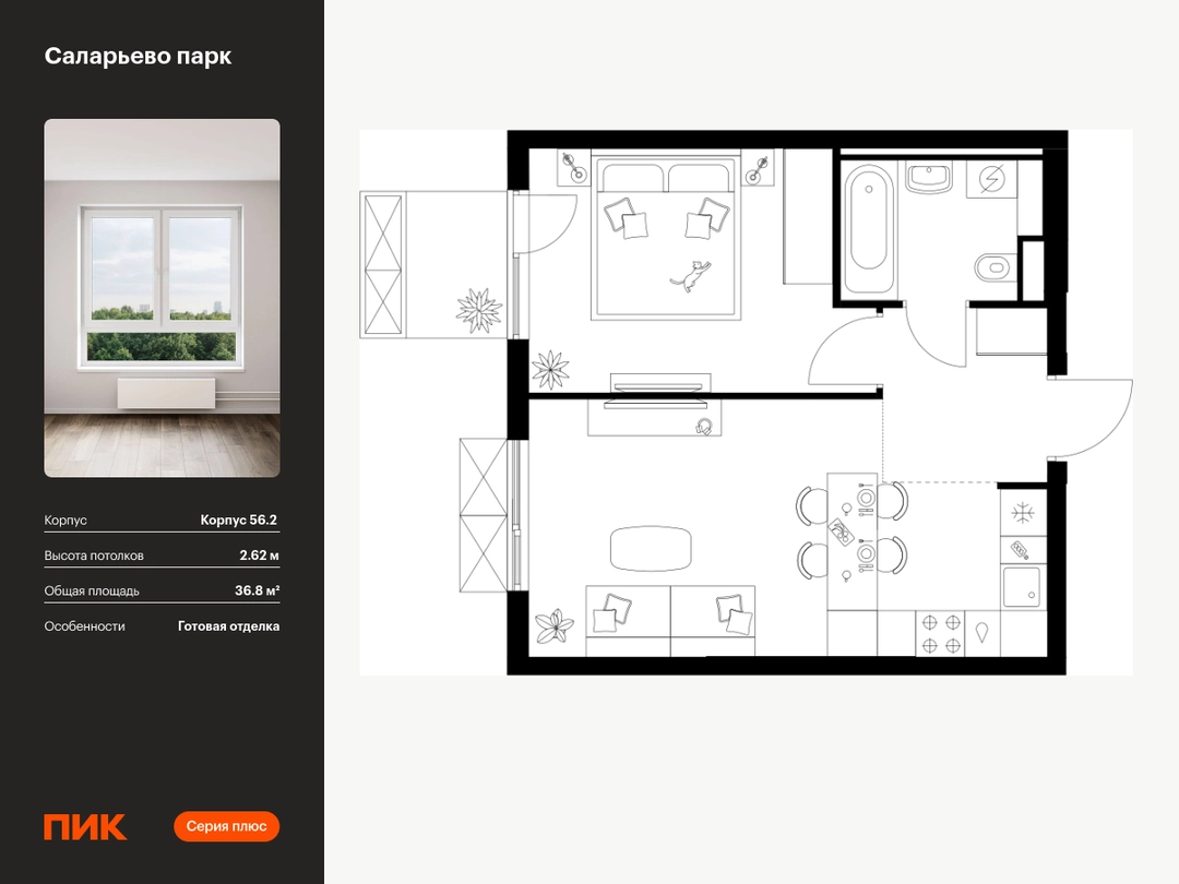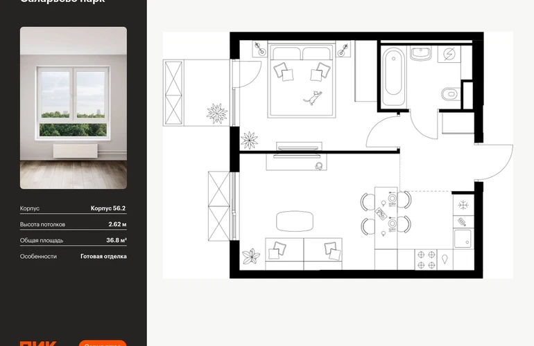 Продаётся 1-комн.квартира площадью 36.80 кв.м на 6 этаже 22 этажного дома (Корпус 56.2 , секция 2) проекта ПИК Саларьево парк. Светлый просторный подъезд на уровне земли, функциональная планировка, большие окна, с отделкой. <br> <br>Жилой район «Саларьево парк» расположен в Новой Москве, в четырёх километрах от МКАД по Киевскому шоссе. Две станции метро: «Саларьево» и «Филатов луг» — находятся в пешей доступности от проекта. Дойти до них можно за 5–10 минут. В квартале уже создана качественная среда, где есть абсолютно всё для полноценной жизни, работы и отдыха. <br> <br>«Саларьево парк» — не просто квартал, а полноценный жилой район, который отличается разноплановой архитектурой. Над концепцией квартала работали несколько ведущих архитектурных бюро, которые стремились добиться разнообразия в фасадных решениях. Ярким примером такого подхода станет корпус 83, который относится к «Серии плюс». <br> <br>Новый корпус 83 был создан по принципам южной архитектуры: расслабленный и лаконичный силуэт зданий, привлекающий к себе внимание. Архитектурная изюминка 83-го корпуса — террасы и фигурные балконы. Вместе с окнами и другими акцентными элементами они создают уникальный облик здания, отсылая нас к изысканной южной архитектуре. <br> <br>Все корпуса в квартале гармонично сочетаются, образуя единую городскую среду. Здесь приятно гулять и проводить время на улице всей семьёй. <br> <br>В «Саларьево парке» создана уникальная образовательная среда, включающая в себя шесть школ, рассчитанных на 6 250 учеников. Две из них уже открыты, их посещает 2 300 детей. Также на территории «Саларьево парка» находится 12 детских садов, один из которых с бассейном. Сейчас уже открыты 7 садов. <br> <br>В «Саларьево парке» открыта уникальная игровая площадка — PlayHub «Оригами». Здесь есть ручей, горка-труба и рельефные холмы. Взрослые смогут отдохнуть в уютном кафе, пока дети играют. Также на территории проекта есть SportHub — большая спортивная зона, разделённая по интересам и возрастам. Здесь можно заниматься разными видами спорта: футболом, баскетболом, волейболом и стритболом. Зимой центральную часть площадки превращают в каток. <br> <br>Во дворах-парках жилого квартала есть места для отдыха, детские и спортивные площадки. На первых этажах домов расположены магазины, кафе и полезные сервисы. Также вблизи проекта есть несколько масштабных торговых центров. До ТЦ «Саларис» пять минут пешком, до «Рио», Metro Cash & Carry и «Леруа Мерлен» — пять минут на автомобиле. Артикул - 990634О застройщике