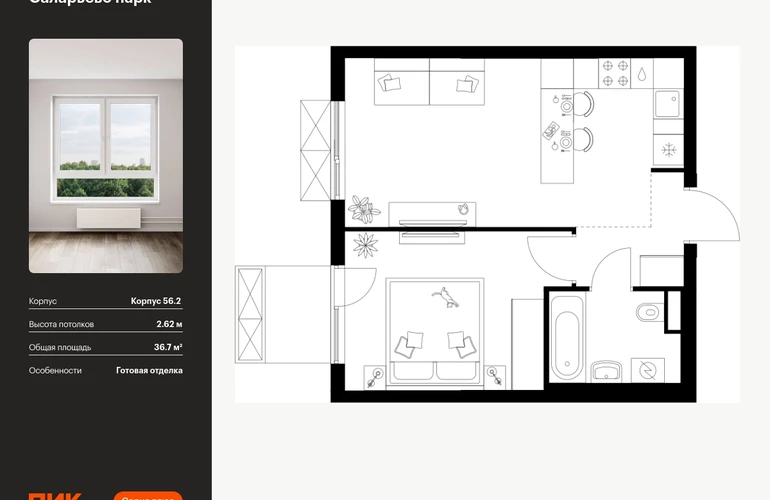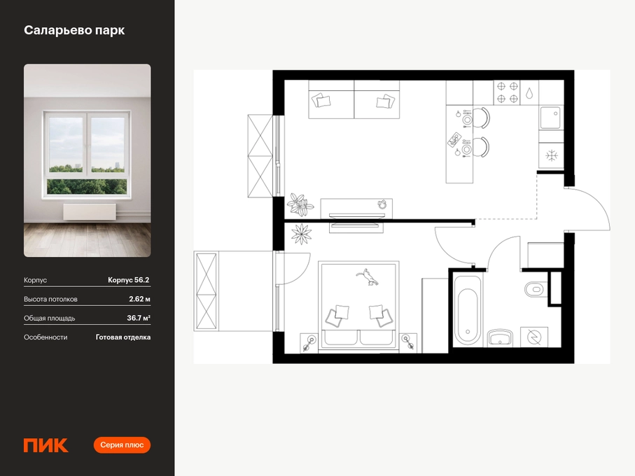 Продаётся 1-комн.квартира площадью 36.70 кв.м на 4 этаже 22 этажного дома (Корпус 56.2 , секция 1) проекта ПИК Саларьево парк. Светлый просторный подъезд на уровне земли, функциональная планировка, большие окна, с отделкой. <br> <br>Жилой район «Саларьево парк» расположен в Новой Москве, в четырёх километрах от МКАД по Киевскому шоссе. Две станции метро: «Саларьево» и «Филатов луг» — находятся в пешей доступности от проекта. Дойти до них можно за 5–10 минут. В квартале уже создана качественная среда, где есть абсолютно всё для полноценной жизни, работы и отдыха. <br> <br>«Саларьево парк» — не просто квартал, а полноценный жилой район, который отличается разноплановой архитектурой. Над концепцией квартала работали несколько ведущих архитектурных бюро, которые стремились добиться разнообразия в фасадных решениях. Ярким примером такого подхода станет корпус 83, который относится к «Серии плюс». <br> <br>Новый корпус 83 был создан по принципам южной архитектуры: расслабленный и лаконичный силуэт зданий, привлекающий к себе внимание. Архитектурная изюминка 83-го корпуса — террасы и фигурные балконы. Вместе с окнами и другими акцентными элементами они создают уникальный облик здания, отсылая нас к изысканной южной архитектуре. <br> <br>Все корпуса в квартале гармонично сочетаются, образуя единую городскую среду. Здесь приятно гулять и проводить время на улице всей семьёй. <br> <br>В «Саларьево парке» создана уникальная образовательная среда, включающая в себя шесть школ, рассчитанных на 6 250 учеников. Две из них уже открыты, их посещает 2 300 детей. Также на территории «Саларьево парка» находится 12 детских садов, один из которых с бассейном. Сейчас уже открыты 7 садов. <br> <br>В «Саларьево парке» открыта уникальная игровая площадка — PlayHub «Оригами». Здесь есть ручей, горка-труба и рельефные холмы. Взрослые смогут отдохнуть в уютном кафе, пока дети играют. Также на территории проекта есть SportHub — большая спортивная зона, разделённая по интересам и возрастам. Здесь можно заниматься разными видами спорта: футболом, баскетболом, волейболом и стритболом. Зимой центральную часть площадки превращают в каток. <br> <br>Во дворах-парках жилого квартала есть места для отдыха, детские и спортивные площадки. На первых этажах домов расположены магазины, кафе и полезные сервисы. Также вблизи проекта есть несколько масштабных торговых центров. До ТЦ «Саларис» пять минут пешком, до «Рио», Metro Cash & Carry и «Лемана про» — пять минут на автомобиле. Артикул - 990001О застройщике