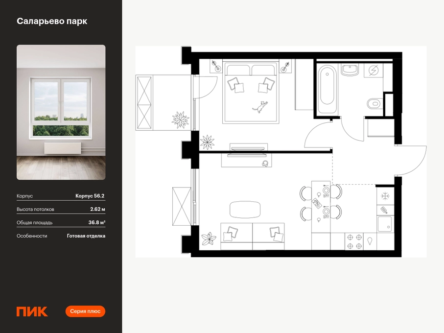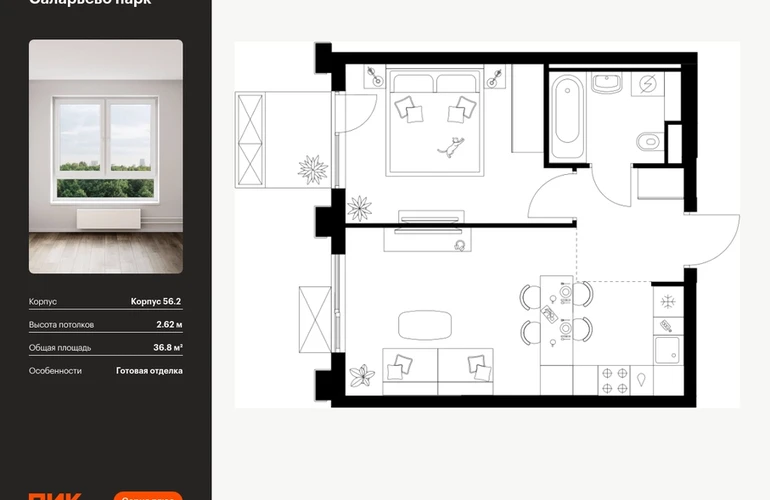 Продаётся 1-комн.квартира площадью 36.80 кв.м на 6 этаже 22 этажного дома (Корпус 56.2 , секция 3) проекта ПИК Саларьево парк. Светлый просторный подъезд на уровне земли, функциональная планировка, большие окна, с отделкой. <br> <br>Жилой район «Саларьево парк» расположен в Новой Москве, в четырёх километрах от МКАД по Киевскому шоссе. Две станции метро: «Саларьево» и «Филатов луг» — находятся в пешей доступности от проекта. Дойти до них можно за 5–10 минут. В квартале уже создана качественная среда, где есть абсолютно всё для полноценной жизни, работы и отдыха. <br> <br>«Саларьево парк» — не просто квартал, а полноценный жилой район, который отличается разноплановой архитектурой. Над концепцией квартала работали несколько ведущих архитектурных бюро, которые стремились добиться разнообразия в фасадных решениях. Ярким примером такого подхода станет корпус 83, который относится к «Серии плюс». <br> <br>Новый корпус 83 был создан по принципам южной архитектуры: расслабленный и лаконичный силуэт зданий, привлекающий к себе внимание. Архитектурная изюминка 83-го корпуса — террасы и фигурные балконы. Вместе с окнами и другими акцентными элементами они создают уникальный облик здания, отсылая нас к изысканной южной архитектуре. <br> <br>Все корпуса в квартале гармонично сочетаются, образуя единую городскую среду. Здесь приятно гулять и проводить время на улице всей семьёй. <br> <br>В «Саларьево парке» создана уникальная образовательная среда, включающая в себя шесть школ, рассчитанных на 6 250 учеников. Две из них уже открыты, их посещает 2 300 детей. Также на территории «Саларьево парка» находится 12 детских садов, один из которых с бассейном. Сейчас уже открыты 7 садов. <br> <br>В «Саларьево парке» открыта уникальная игровая площадка — PlayHub «Оригами». Здесь есть ручей, горка-труба и рельефные холмы. Взрослые смогут отдохнуть в уютном кафе, пока дети играют. Также на территории проекта есть SportHub — большая спортивная зона, разделённая по интересам и возрастам. Здесь можно заниматься разными видами спорта: футболом, баскетболом, волейболом и стритболом. Зимой центральную часть площадки превращают в каток. <br> <br>Во дворах-парках жилого квартала есть места для отдыха, детские и спортивные площадки. На первых этажах домов расположены магазины, кафе и полезные сервисы. Также вблизи проекта есть несколько масштабных торговых центров. До ТЦ «Саларис» пять минут пешком, до «Рио», Metro Cash & Carry и «Леруа Мерлен» — пять минут на автомобиле. Артикул - 990376О застройщике