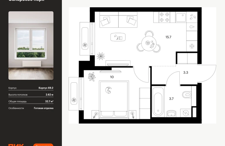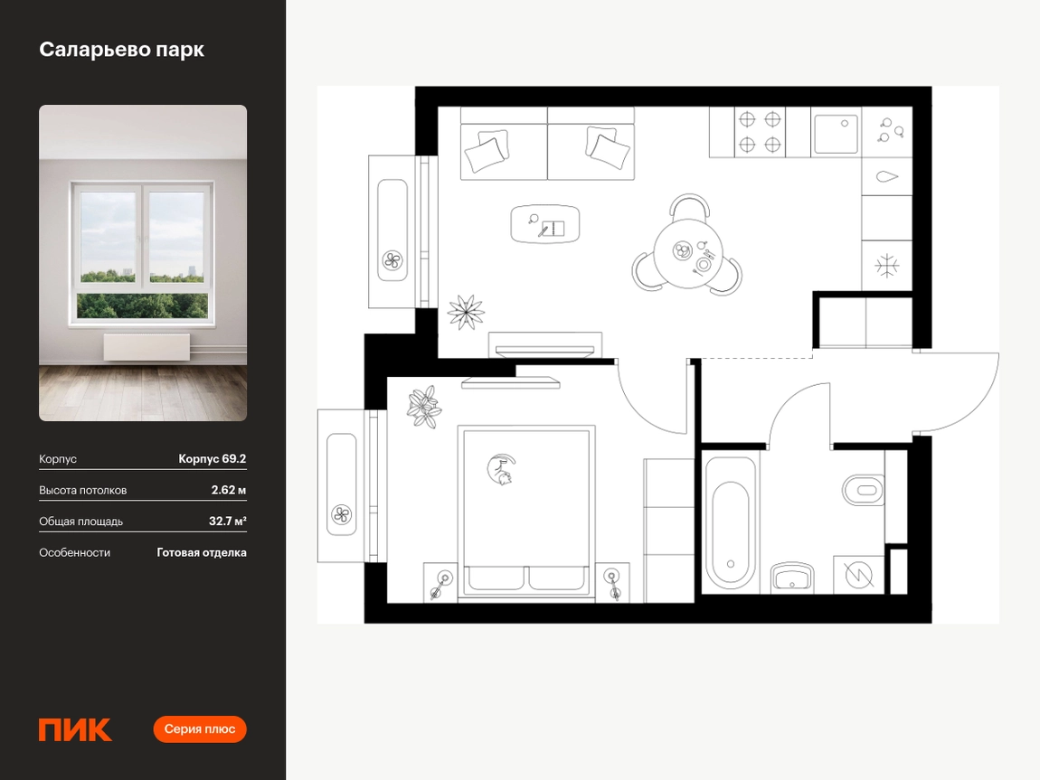 Продаётся 1-комн.квартира площадью 32.70 кв.м на 8 этаже 14 этажного дома (Корпус 69.2, секция 2) проекта ПИК Саларьево парк. Светлый просторный подъезд на уровне земли, функциональная планировка, большие окна, с отделкой. <br> <br>Жилой район «Саларьево парк» расположен в Новой Москве, в четырёх километрах от МКАД по Киевскому шоссе. Две станции метро: «Саларьево» и «Филатов луг» — находятся в пешей доступности от проекта. Дойти до них можно за 5–10 минут. В квартале уже создана качественная среда, где есть абсолютно всё для полноценной жизни, работы и отдыха. <br> <br>«Саларьево парк» — не просто квартал, а полноценный жилой район, который отличается разноплановой архитектурой. Над концепцией квартала работали несколько ведущих архитектурных бюро, которые стремились добиться разнообразия в фасадных решениях. Ярким примером такого подхода станет корпус 83, который относится к «Серии плюс». <br> <br>Новый корпус 83 был создан по принципам южной архитектуры: расслабленный и лаконичный силуэт зданий, привлекающий к себе внимание. Архитектурная изюминка 83-го корпуса — террасы и фигурные балконы. Вместе с окнами и другими акцентными элементами они создают уникальный облик здания, отсылая нас к изысканной южной архитектуре. <br> <br>Все корпуса в квартале гармонично сочетаются, образуя единую городскую среду. Здесь приятно гулять и проводить время на улице всей семьёй. <br> <br>В «Саларьево парке» создана уникальная образовательная среда, включающая в себя шесть школ, рассчитанных на 6 250 учеников. Две из них уже открыты, их посещает 2 300 детей. Также на территории «Саларьево парка» находится 12 детских садов, один из которых с бассейном. Сейчас уже открыты 7 садов. <br> <br>В «Саларьево парке» открыта уникальная игровая площадка — PlayHub «Оригами». Здесь есть ручей, горка-труба и рельефные холмы. Взрослые смогут отдохнуть в уютном кафе, пока дети играют. Также на территории проекта есть SportHub — большая спортивная зона, разделённая по интересам и возрастам. Здесь можно заниматься разными видами спорта: футболом, баскетболом, волейболом и стритболом. Зимой центральную часть площадки превращают в каток. <br> <br>Во дворах-парках жилого квартала есть места для отдыха, детские и спортивные площадки. На первых этажах домов расположены магазины, кафе и полезные сервисы. Также вблизи проекта есть несколько масштабных торговых центров. До ТЦ «Саларис» пять минут пешком, до «Рио», Metro Cash & Carry и «Лемана про» — пять минут на автомобиле. Артикул - 1023500О застройщике