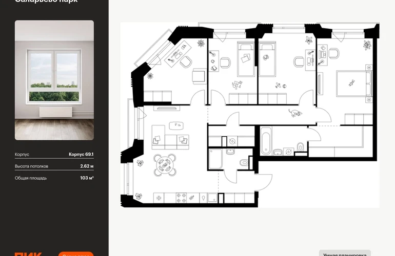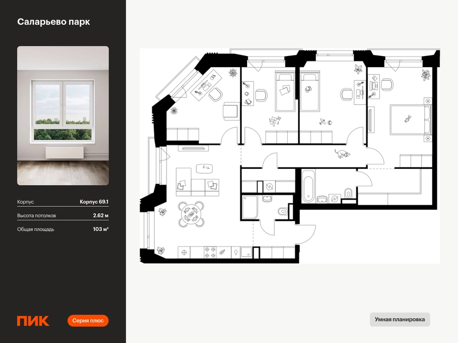 Продаётся 4-комн.квартира площадью 103.00 кв.м на 7 этаже 23 этажного дома (Корпус 69.1, секция 1) проекта ПИК Саларьево парк. Светлый просторный подъезд на уровне земли, функциональная планировка, большие окна, с отделкой. <br> <br>Жилой район «Саларьево парк» расположен в Новой Москве, в четырёх километрах от МКАД по Киевскому шоссе. Две станции метро: «Саларьево» и «Филатов луг» — находятся в пешей доступности от проекта. Дойти до них можно за 5–10 минут. В квартале уже создана качественная среда, где есть абсолютно всё для полноценной жизни, работы и отдыха. <br> <br>«Саларьево парк» — не просто квартал, а полноценный жилой район, который отличается разноплановой архитектурой. Над концепцией квартала работали несколько ведущих архитектурных бюро, которые стремились добиться разнообразия в фасадных решениях. Ярким примером такого подхода станет корпус 83, который относится к «Серии плюс». <br> <br>Новый корпус 83 был создан по принципам южной архитектуры: расслабленный и лаконичный силуэт зданий, привлекающий к себе внимание. Архитектурная изюминка 83-го корпуса — террасы и фигурные балконы. Вместе с окнами и другими акцентными элементами они создают уникальный облик здания, отсылая нас к изысканной южной архитектуре. <br> <br>Все корпуса в квартале гармонично сочетаются, образуя единую городскую среду. Здесь приятно гулять и проводить время на улице всей семьёй. <br> <br>В «Саларьево парке» создана уникальная образовательная среда, включающая в себя шесть школ, рассчитанных на 6 250 учеников. Две из них уже открыты, их посещает 2 300 детей. Также на территории «Саларьево парка» находится 12 детских садов, один из которых с бассейном. Сейчас уже открыты 7 садов. <br> <br>В «Саларьево парке» открыта уникальная игровая площадка — PlayHub «Оригами». Здесь есть ручей, горка-труба и рельефные холмы. Взрослые смогут отдохнуть в уютном кафе, пока дети играют. Также на территории проекта есть SportHub — большая спортивная зона, разделённая по интересам и возрастам. Здесь можно заниматься разными видами спорта: футболом, баскетболом, волейболом и стритболом. Зимой центральную часть площадки превращают в каток. <br> <br>Во дворах-парках жилого квартала есть места для отдыха, детские и спортивные площадки. На первых этажах домов расположены магазины, кафе и полезные сервисы. Также вблизи проекта есть несколько масштабных торговых центров. До ТЦ «Саларис» пять минут пешком, до «Рио», Metro Cash & Carry и «Леруа Мерлен» — пять минут на автомобиле. Артикул - 1023242О застройщике