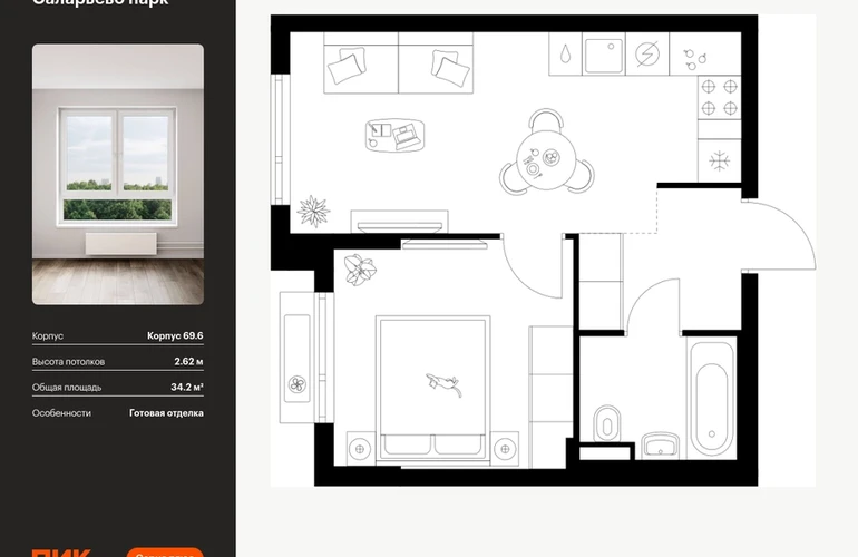 Продаётся 1-комн.квартира площадью 34.20 кв.м на 10 этаже 14 этажного дома (Корпус 69.6, секция 6) проекта ПИК Саларьево парк. Светлый просторный подъезд на уровне земли, функциональная планировка, большие окна, с отделкой. Артикул - 1024062О застройщике
