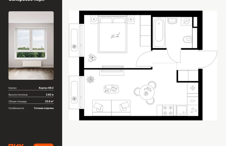 Продаётся 1-комн.квартира площадью 32.60 кв.м на 12 этаже 14 этажного дома (Корпус 69.2, секция 2) проекта ПИК Саларьево парк. Светлый просторный подъезд на уровне земли, функциональная планировка, большие окна, с отделкой. <br> <br>Жилой район «Саларьево парк» расположен в Новой Москве, в четырёх километрах от МКАД по Киевскому шоссе. Две станции метро: «Саларьево» и «Филатов луг» — находятся в пешей доступности от проекта. Дойти до них можно за 5–10 минут. В квартале уже создана качественная среда, где есть абсолютно всё для полноценной жизни, работы и отдыха. <br> <br>«Саларьево парк» — не просто квартал, а полноценный жилой район, который отличается разноплановой архитектурой. Над концепцией квартала работали несколько ведущих архитектурных бюро, которые стремились добиться разнообразия в фасадных решениях. Ярким примером такого подхода станет корпус 83, который относится к «Серии плюс». <br> <br>Новый корпус 83 был создан по принципам южной архитектуры: расслабленный и лаконичный силуэт зданий, привлекающий к себе внимание. Архитектурная изюминка 83-го корпуса — террасы и фигурные балконы. Вместе с окнами и другими акцентными элементами они создают уникальный облик здания, отсылая нас к изысканной южной архитектуре. <br> <br>Все корпуса в квартале гармонично сочетаются, образуя единую городскую среду. Здесь приятно гулять и проводить время на улице всей семьёй. <br> <br>В «Саларьево парке» создана уникальная образовательная среда, включающая в себя шесть школ, рассчитанных на 6 250 учеников. Две из них уже открыты, их посещает 2 300 детей. Также на территории «Саларьево парка» находится 12 детских садов, один из которых с бассейном. Сейчас уже открыты 7 садов. <br> <br>В «Саларьево парке» открыта уникальная игровая площадка — PlayHub «Оригами». Здесь есть ручей, горка-труба и рельефные холмы. Взрослые смогут отдохнуть в уютном кафе, пока дети играют. Также на территории проекта есть SportHub — большая спортивная зона, разделённая по интересам и возрастам. Здесь можно заниматься разными видами спорта: футболом, баскетболом, волейболом и стритболом. Зимой центральную часть площадки превращают в каток. <br> <br>Во дворах-парках жилого квартала есть места для отдыха, детские и спортивные площадки. На первых этажах домов расположены магазины, кафе и полезные сервисы. Также вблизи проекта есть несколько масштабных торговых центров. До ТЦ «Саларис» пять минут пешком, до «Рио», Metro Cash & Carry и «Лемана про» — пять минут на автомобиле. Артикул - 1023544О застройщике