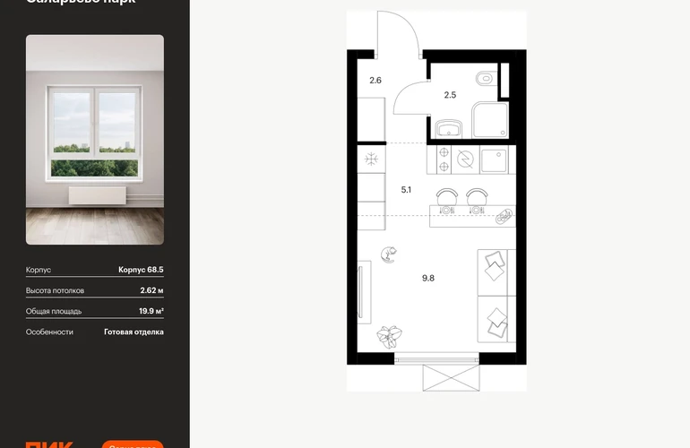Продаётся квартира-студия площадью 19.90 кв.м на 19 этаже 24 этажного дома (Корпус 68.5, секция 5) проекта ПИК Саларьево парк. Светлый просторный подъезд на уровне земли, функциональная планировка, большие окна, с отделкой. <br> <br>Жилой район «Саларьево парк» расположен в Новой Москве, в четырёх километрах от МКАД по Киевскому шоссе. Две станции метро: «Саларьево» и «Филатов луг» — находятся в пешей доступности от проекта. Дойти до них можно за 5–10 минут. В квартале уже создана качественная среда, где есть абсолютно всё для полноценной жизни, работы и отдыха. <br> <br>«Саларьево парк» — не просто квартал, а полноценный жилой район, который отличается разноплановой архитектурой. Над концепцией квартала работали несколько ведущих архитектурных бюро, которые стремились добиться разнообразия в фасадных решениях. Ярким примером такого подхода станет корпус 83, который относится к «Серии плюс». <br> <br>Новый корпус 83 был создан по принципам южной архитектуры: расслабленный и лаконичный силуэт зданий, привлекающий к себе внимание. Архитектурная изюминка 83-го корпуса — террасы и фигурные балконы. Вместе с окнами и другими акцентными элементами они создают уникальный облик здания, отсылая нас к изысканной южной архитектуре. <br> <br>Все корпуса в квартале гармонично сочетаются, образуя единую городскую среду. Здесь приятно гулять и проводить время на улице всей семьёй. <br> <br>В «Саларьево парке» создана уникальная образовательная среда, включающая в себя шесть школ, рассчитанных на 6 250 учеников. Две из них уже открыты, их посещает 2 300 детей. Также на территории «Саларьево парка» находится 12 детских садов, один из которых с бассейном. Сейчас уже открыты 7 садов. <br> <br>В «Саларьево парке» открыта уникальная игровая площадка — PlayHub «Оригами». Здесь есть ручей, горка-труба и рельефные холмы. Взрослые смогут отдохнуть в уютном кафе, пока дети играют. Также на территории проекта есть SportHub — большая спортивная зона, разделённая по интересам и возрастам. Здесь можно заниматься разными видами спорта: футболом, баскетболом, волейболом и стритболом. Зимой центральную часть площадки превращают в каток. <br> <br>Во дворах-парках жилого квартала есть места для отдыха, детские и спортивные площадки. На первых этажах домов расположены магазины, кафе и полезные сервисы. Также вблизи проекта есть несколько масштабных торговых центров. До ТЦ «Саларис» пять минут пешком, до «Рио», Metro Cash & Carry и «Лемана про» — пять минут на автомобиле. Артикул - 868187О застройщике