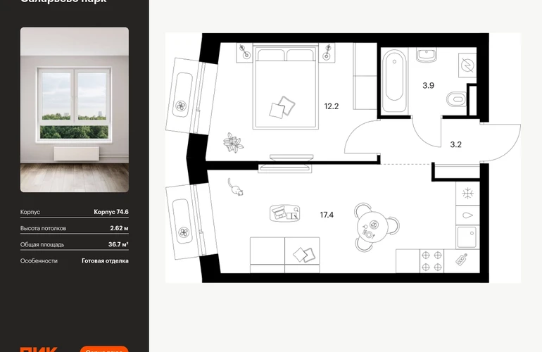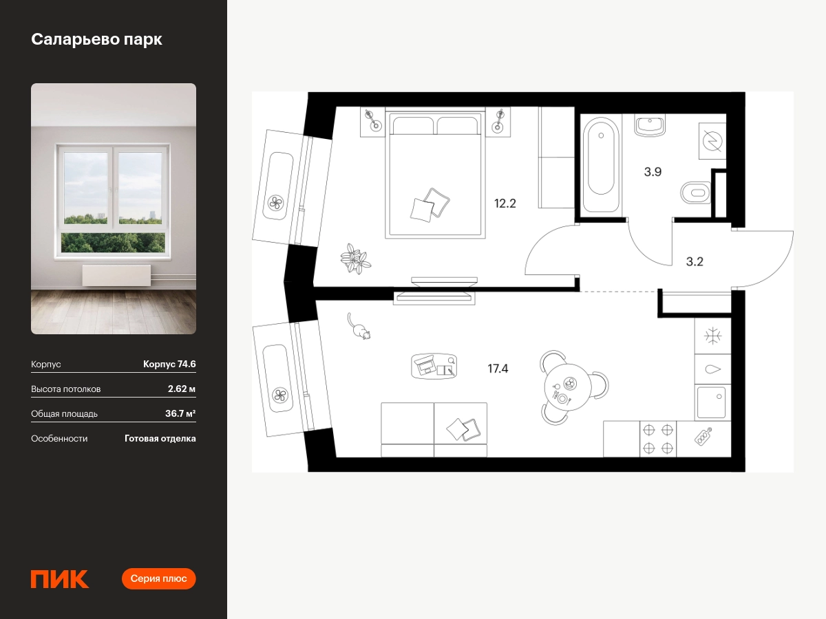 Продаётся 1-комн.квартира площадью 36.70 кв.м на 5 этаже 18 этажного дома (Корпус 74.6, секция 6) проекта ПИК Саларьево парк. Светлый просторный подъезд на уровне земли, функциональная планировка, большие окна, с отделкой. Жилой район «Саларьево парк» расположен в Новой Москве, в четырёх километрах от МКАД по Киевскому шоссе. Две станции метро: «Саларьево» и «Филатов луг» — находятся в пешей доступности от проекта. Дойти до них можно за 5–10 минут. В квартале уже создана качественная среда, где есть абсолютно всё для полноценной жизни, работы и отдыха. «Саларьево парк» — не просто квартал, а полноценный жилой район, который отличается разноплановой архитектурой. Над концепцией квартала работали несколько ведущих архитектурных бюро, которые стремились добиться разнообразия в фасадных решениях. Ярким примером такого подхода станет корпус 83, который относится к «Серии плюс». Новый корпус 83 был создан по принципам южной архитектуры: расслабленный и лаконичный силуэт зданий, привлекающий к себе внимание. Архитектурная изюминка 83-го корпуса — террасы и фигурные балконы. Вместе с окнами и другими акцентными элементами они создают уникальный облик здания, отсылая нас к изысканной южной архитектуре. Все корпуса в квартале гармонично сочетаются, образуя единую городскую среду. Здесь приятно гулять и проводить время на улице всей семьёй. В «Саларьево парке» создана уникальная образовательная среда, включающая в себя шесть школ, рассчитанных на 6 250 учеников. Две из них уже открыты, их посещает 2 300 детей. Также на территории «Саларьево парка» находится 12 детских садов, один из которых с бассейном. Сейчас уже открыты 7 садов. В «Саларьево парке» открыта уникальная игровая площадка — PlayHub «Оригами». Здесь есть ручей, горка-труба и рельефные холмы. Взрослые смогут отдохнуть в уютном кафе, пока дети играют. Также на территории проекта есть SportHub — большая спортивная зона, разделённая по интересам и возрастам. Здесь можно заниматься разными видами спорта: футболом, баскетболом, волейболом и стритболом. Зимой центральную часть площадки превращают в каток. Во дворах-парках жилого квартала есть места для отдыха, детские и спортивные площадки. На первых этажах домов расположены магазины, кафе и полезные сервисы. Также вблизи проекта есть несколько масштабных торговых центров. До ТЦ «Саларис» пять минут пешком, до «Рио», Metro Cash & Carry и «Лемана про» — пять минут на автомобиле. Артикул - 1006813О застройщике
