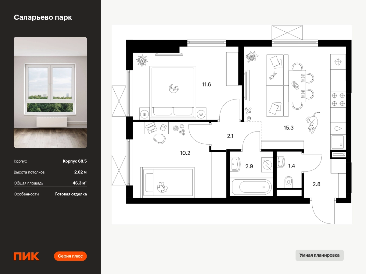 Продаётся 2-комн.квартира площадью 46.30 кв.м на 14 этаже 24 этажного дома (Корпус 68.5, секция 5) проекта ПИК Саларьево парк. Светлый просторный подъезд на уровне земли, функциональная планировка, большие окна, с отделкой. <br> <br>Жилой район «Саларьево парк» расположен в Новой Москве, в четырёх километрах от МКАД по Киевскому шоссе. Две станции метро: «Саларьево» и «Филатов луг» — находятся в пешей доступности от проекта. Дойти до них можно за 5–10 минут. В квартале уже создана качественная среда, где есть абсолютно всё для полноценной жизни, работы и отдыха. <br> <br>«Саларьево парк» — не просто квартал, а полноценный жилой район, который отличается разноплановой архитектурой. Над концепцией квартала работали несколько ведущих архитектурных бюро, которые стремились добиться разнообразия в фасадных решениях. Ярким примером такого подхода станет корпус 83, который относится к «Серии плюс». <br> <br>Новый корпус 83 был создан по принципам южной архитектуры: расслабленный и лаконичный силуэт зданий, привлекающий к себе внимание. Архитектурная изюминка 83-го корпуса — террасы и фигурные балконы. Вместе с окнами и другими акцентными элементами они создают уникальный облик здания, отсылая нас к изысканной южной архитектуре. <br> <br>Все корпуса в квартале гармонично сочетаются, образуя единую городскую среду. Здесь приятно гулять и проводить время на улице всей семьёй. <br> <br>В «Саларьево парке» создана уникальная образовательная среда, включающая в себя шесть школ, рассчитанных на 6 250 учеников. Две из них уже открыты, их посещает 2 300 детей. Также на территории «Саларьево парка» находится 12 детских садов, один из которых с бассейном. Сейчас уже открыты 7 садов. <br> <br>В «Саларьево парке» открыта уникальная игровая площадка — PlayHub «Оригами». Здесь есть ручей, горка-труба и рельефные холмы. Взрослые смогут отдохнуть в уютном кафе, пока дети играют. Также на территории проекта есть SportHub — большая спортивная зона, разделённая по интересам и возрастам. Здесь можно заниматься разными видами спорта: футболом, баскетболом, волейболом и стритболом. Зимой центральную часть площадки превращают в каток. <br> <br>Во дворах-парках жилого квартала есть места для отдыха, детские и спортивные площадки. На первых этажах домов расположены магазины, кафе и полезные сервисы. Также вблизи проекта есть несколько масштабных торговых центров. До ТЦ «Саларис» пять минут пешком, до «Рио», Metro Cash & Carry и «Лемана про» — пять минут на автомобиле. Артикул - 867995О застройщике