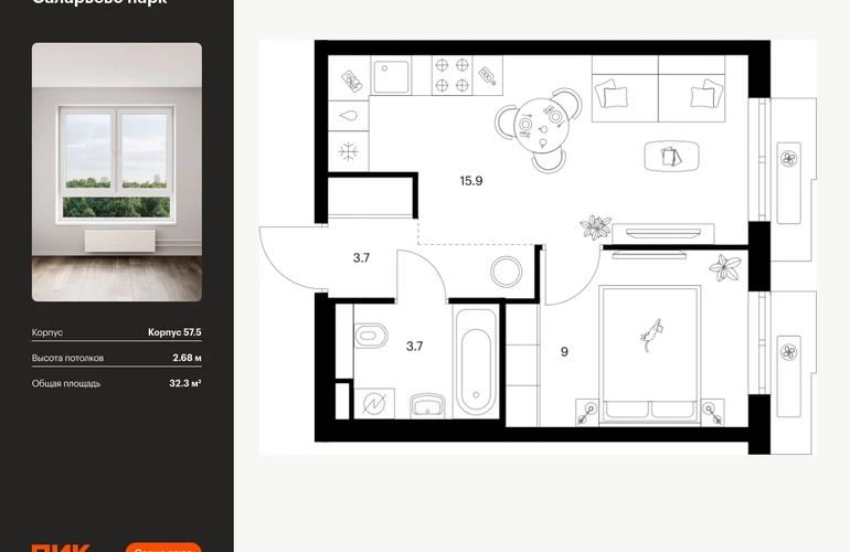Продаётся 1-комн.квартира площадью 32.30 кв.м на 6 этаже 14 этажного дома (Корпус 57.5, секция 5) проекта ПИК Саларьево парк. Светлый просторный подъезд на уровне земли, функциональная планировка, большие окна, с отделкой. <br> <br>Жилой район «Саларьево парк» расположен в Новой Москве, в четырёх километрах от МКАД по Киевскому шоссе. Две станции метро: «Саларьево» и «Филатов луг» — находятся в пешей доступности от проекта. Дойти до них можно за 5–10 минут. В квартале уже создана качественная среда, где есть абсолютно всё для полноценной жизни, работы и отдыха. <br> <br>«Саларьево парк» — не просто квартал, а полноценный жилой район, который отличается разноплановой архитектурой. Над концепцией квартала работали несколько ведущих архитектурных бюро, которые стремились добиться разнообразия в фасадных решениях. Ярким примером такого подхода станет корпус 83, который относится к «Серии плюс». <br> <br>Новый корпус 83 был создан по принципам южной архитектуры: расслабленный и лаконичный силуэт зданий, привлекающий к себе внимание. Архитектурная изюминка 83-го корпуса — террасы и фигурные балконы. Вместе с окнами и другими акцентными элементами они создают уникальный облик здания, отсылая нас к изысканной южной архитектуре. <br> <br>Все корпуса в квартале гармонично сочетаются, образуя единую городскую среду. Здесь приятно гулять и проводить время на улице всей семьёй. <br> <br>В «Саларьево парке» создана уникальная образовательная среда, включающая в себя шесть школ, рассчитанных на 6 250 учеников. Две из них уже открыты, их посещает 2 300 детей. Также на территории «Саларьево парка» находится 12 детских садов, один из которых с бассейном. Сейчас уже открыты 7 садов. <br> <br>В «Саларьево парке» открыта уникальная игровая площадка — PlayHub «Оригами». Здесь есть ручей, горка-труба и рельефные холмы. Взрослые смогут отдохнуть в уютном кафе, пока дети играют. Также на территории проекта есть SportHub — большая спортивная зона, разделённая по интересам и возрастам. Здесь можно заниматься разными видами спорта: футболом, баскетболом, волейболом и стритболом. Зимой центральную часть площадки превращают в каток. <br> <br>Во дворах-парках жилого квартала есть места для отдыха, детские и спортивные площадки. На первых этажах домов расположены магазины, кафе и полезные сервисы. Также вблизи проекта есть несколько масштабных торговых центров. До ТЦ «Саларис» пять минут пешком, до «Рио», Metro Cash & Carry и «Лемана про» — пять минут на автомобиле. Артикул - 1018733О застройщике