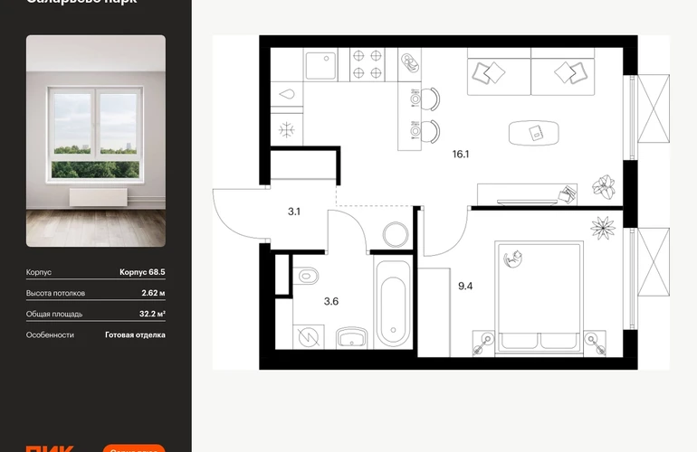 Продаётся 1-комн.квартира площадью 32.20 кв.м на 23 этаже 24 этажного дома (Корпус 68.5, секция 5) проекта ПИК Саларьево парк. Светлый просторный подъезд на уровне земли, функциональная планировка, большие окна, с отделкой. <br> <br>Жилой район «Саларьево парк» расположен в Новой Москве, в четырёх километрах от МКАД по Киевскому шоссе. Две станции метро: «Саларьево» и «Филатов луг» — находятся в пешей доступности от проекта. Дойти до них можно за 5–10 минут. В квартале уже создана качественная среда, где есть абсолютно всё для полноценной жизни, работы и отдыха. <br> <br>«Саларьево парк» — не просто квартал, а полноценный жилой район, который отличается разноплановой архитектурой. Над концепцией квартала работали несколько ведущих архитектурных бюро, которые стремились добиться разнообразия в фасадных решениях. Ярким примером такого подхода станет корпус 83, который относится к «Серии плюс». <br> <br>Новый корпус 83 был создан по принципам южной архитектуры: расслабленный и лаконичный силуэт зданий, привлекающий к себе внимание. Архитектурная изюминка 83-го корпуса — террасы и фигурные балконы. Вместе с окнами и другими акцентными элементами они создают уникальный облик здания, отсылая нас к изысканной южной архитектуре. <br> <br>Все корпуса в квартале гармонично сочетаются, образуя единую городскую среду. Здесь приятно гулять и проводить время на улице всей семьёй. <br> <br>В «Саларьево парке» создана уникальная образовательная среда, включающая в себя шесть школ, рассчитанных на 6 250 учеников. Две из них уже открыты, их посещает 2 300 детей. Также на территории «Саларьево парка» находится 12 детских садов, один из которых с бассейном. Сейчас уже открыты 7 садов. <br> <br>В «Саларьево парке» открыта уникальная игровая площадка — PlayHub «Оригами». Здесь есть ручей, горка-труба и рельефные холмы. Взрослые смогут отдохнуть в уютном кафе, пока дети играют. Также на территории проекта есть SportHub — большая спортивная зона, разделённая по интересам и возрастам. Здесь можно заниматься разными видами спорта: футболом, баскетболом, волейболом и стритболом. Зимой центральную часть площадки превращают в каток. <br> <br>Во дворах-парках жилого квартала есть места для отдыха, детские и спортивные площадки. На первых этажах домов расположены магазины, кафе и полезные сервисы. Также вблизи проекта есть несколько масштабных торговых центров. До ТЦ «Саларис» пять минут пешком, до «Рио», Metro Cash & Carry и «Лемана про» — пять минут на автомобиле. Артикул - 868248О застройщике