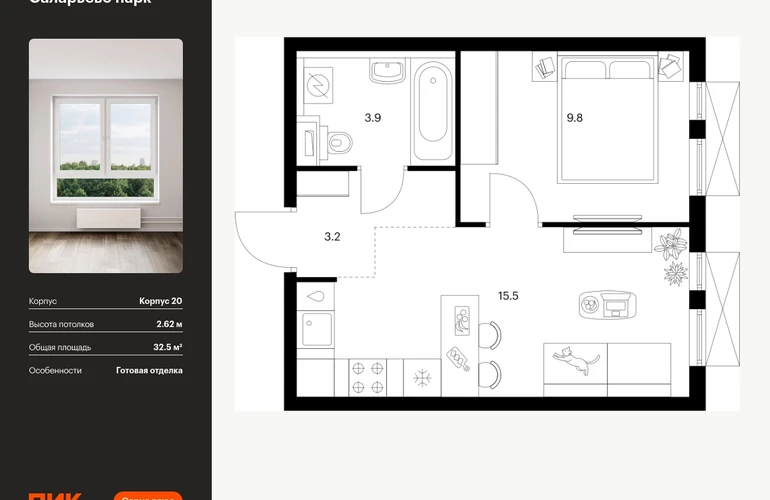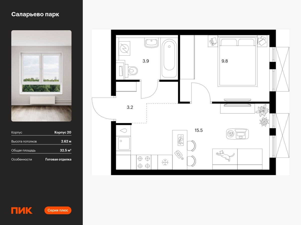 Продаётся 1-комн.квартира площадью 32.50 кв.м на 14 этаже 16 этажного дома (Корпус 20, секция 2) проекта ПИК Саларьево парк. Светлый просторный подъезд на уровне земли, функциональная планировка, большие окна, с отделкой. <br> <br>Жилой район «Саларьево парк» расположен в Новой Москве, в четырёх километрах от МКАД по Киевскому шоссе. Две станции метро: «Саларьево» и «Филатов луг» — находятся в пешей доступности от проекта. Дойти до них можно за 5–10 минут. В квартале уже создана качественная среда, где есть абсолютно всё для полноценной жизни, работы и отдыха. <br> <br>«Саларьево парк» — не просто квартал, а полноценный жилой район, который отличается разноплановой архитектурой. Над концепцией квартала работали несколько ведущих архитектурных бюро, которые стремились добиться разнообразия в фасадных решениях. Ярким примером такого подхода станет корпус 83, который относится к «Серии плюс». <br> <br>Новый корпус 83 был создан по принципам южной архитектуры: расслабленный и лаконичный силуэт зданий, привлекающий к себе внимание. Архитектурная изюминка 83-го корпуса — террасы и фигурные балконы. Вместе с окнами и другими акцентными элементами они создают уникальный облик здания, отсылая нас к изысканной южной архитектуре. <br> <br>Все корпуса в квартале гармонично сочетаются, образуя единую городскую среду. Здесь приятно гулять и проводить время на улице всей семьёй. <br> <br>В «Саларьево парке» создана уникальная образовательная среда, включающая в себя шесть школ, рассчитанных на 6 250 учеников. Две из них уже открыты, их посещает 2 300 детей. Также на территории «Саларьево парка» находится 12 детских садов, один из которых с бассейном. Сейчас уже открыты 7 садов. <br> <br>В «Саларьево парке» открыта уникальная игровая площадка — PlayHub «Оригами». Здесь есть ручей, горка-труба и рельефные холмы. Взрослые смогут отдохнуть в уютном кафе, пока дети играют. Также на территории проекта есть SportHub — большая спортивная зона, разделённая по интересам и возрастам. Здесь можно заниматься разными видами спорта: футболом, баскетболом, волейболом и стритболом. Зимой центральную часть площадки превращают в каток. <br> <br>Во дворах-парках жилого квартала есть места для отдыха, детские и спортивные площадки. На первых этажах домов расположены магазины, кафе и полезные сервисы. Также вблизи проекта есть несколько масштабных торговых центров. До ТЦ «Саларис» пять минут пешком, до «Рио», Metro Cash & Carry и «Лемана про» — пять минут на автомобиле. Артикул - 946967О застройщике