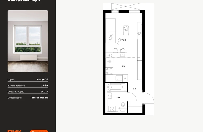 Продаётся квартира-студия площадью 24.70 кв.м на 9 этаже 16 этажного дома (Корпус 20, секция 2) проекта ПИК Саларьево парк. Светлый просторный подъезд на уровне земли, функциональная планировка, большие окна, с отделкой. Жилой район «Саларьево парк» расположен в Новой Москве, в четырёх километрах от МКАД по Киевскому шоссе. Две станции метро: «Саларьево» и «Филатов луг» — находятся в пешей доступности от проекта. Дойти до них можно за 5–10 минут. В квартале уже создана качественная среда, где есть абсолютно всё для полноценной жизни, работы и отдыха. «Саларьево парк» — не просто квартал, а полноценный жилой район, который отличается разноплановой архитектурой. Над концепцией квартала работали несколько ведущих архитектурных бюро, которые стремились добиться разнообразия в фасадных решениях. Ярким примером такого подхода станет корпус 83, который относится к «Серии плюс». Новый корпус 83 был создан по принципам южной архитектуры: расслабленный и лаконичный силуэт зданий, привлекающий к себе внимание. Архитектурная изюминка 83-го корпуса — террасы и фигурные балконы. Вместе с окнами и другими акцентными элементами они создают уникальный облик здания, отсылая нас к изысканной южной архитектуре. Все корпуса в квартале гармонично сочетаются, образуя единую городскую среду. Здесь приятно гулять и проводить время на улице всей семьёй. В «Саларьево парке» создана уникальная образовательная среда, включающая в себя шесть школ, рассчитанных на 6 250 учеников. Две из них уже открыты, их посещает 2 300 детей. Также на территории «Саларьево парка» находится 12 детских садов, один из которых с бассейном. Сейчас уже открыты 7 садов. В «Саларьево парке» открыта уникальная игровая площадка — PlayHub «Оригами». Здесь есть ручей, горка-труба и рельефные холмы. Взрослые смогут отдохнуть в уютном кафе, пока дети играют. Также на территории проекта есть SportHub — большая спортивная зона, разделённая по интересам и возрастам. Здесь можно заниматься разными видами спорта: футболом, баскетболом, волейболом и стритболом. Зимой центральную часть площадки превращают в каток. Во дворах-парках жилого квартала есть места для отдыха, детские и спортивные площадки. На первых этажах домов расположены магазины, кафе и полезные сервисы. Также вблизи проекта есть несколько масштабных торговых центров. До ТЦ «Саларис» пять минут пешком, до «Рио», Metro Cash & Carry и «Лемана про» — пять минут на автомобиле. Артикул - 946905О застройщике