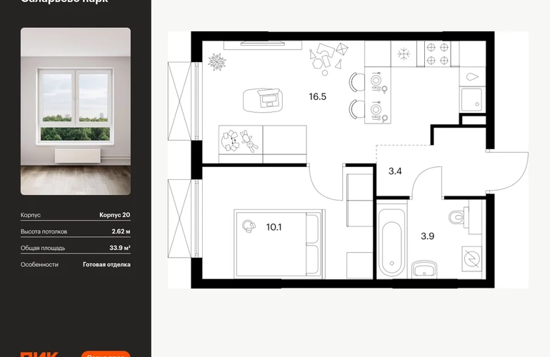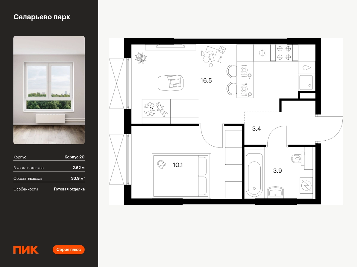 Продаётся 1-комн.квартира площадью 33.90 кв.м на 9 этаже 17 этажного дома (Корпус 20, секция 1) проекта ПИК Саларьево парк. Светлый просторный подъезд на уровне земли, функциональная планировка, большие окна, с отделкой. <br> <br>Жилой район «Саларьево парк» расположен в Новой Москве, в четырёх километрах от МКАД по Киевскому шоссе. Две станции метро: «Саларьево» и «Филатов луг» — находятся в пешей доступности от проекта. Дойти до них можно за 5–10 минут. В квартале уже создана качественная среда, где есть абсолютно всё для полноценной жизни, работы и отдыха. <br> <br>«Саларьево парк» — не просто квартал, а полноценный жилой район, который отличается разноплановой архитектурой. Над концепцией квартала работали несколько ведущих архитектурных бюро, которые стремились добиться разнообразия в фасадных решениях. Ярким примером такого подхода станет корпус 83, который относится к «Серии плюс». <br> <br>Новый корпус 83 был создан по принципам южной архитектуры: расслабленный и лаконичный силуэт зданий, привлекающий к себе внимание. Архитектурная изюминка 83-го корпуса — террасы и фигурные балконы. Вместе с окнами и другими акцентными элементами они создают уникальный облик здания, отсылая нас к изысканной южной архитектуре. <br> <br>Все корпуса в квартале гармонично сочетаются, образуя единую городскую среду. Здесь приятно гулять и проводить время на улице всей семьёй. <br> <br>В «Саларьево парке» создана уникальная образовательная среда, включающая в себя шесть школ, рассчитанных на 6 250 учеников. Две из них уже открыты, их посещает 2 300 детей. Также на территории «Саларьево парка» находится 12 детских садов, один из которых с бассейном. Сейчас уже открыты 7 садов. <br> <br>В «Саларьево парке» открыта уникальная игровая площадка — PlayHub «Оригами». Здесь есть ручей, горка-труба и рельефные холмы. Взрослые смогут отдохнуть в уютном кафе, пока дети играют. Также на территории проекта есть SportHub — большая спортивная зона, разделённая по интересам и возрастам. Здесь можно заниматься разными видами спорта: футболом, баскетболом, волейболом и стритболом. Зимой центральную часть площадки превращают в каток. <br> <br>Во дворах-парках жилого квартала есть места для отдыха, детские и спортивные площадки. На первых этажах домов расположены магазины, кафе и полезные сервисы. Также вблизи проекта есть несколько масштабных торговых центров. До ТЦ «Саларис» пять минут пешком, до «Рио», Metro Cash & Carry и «Лемана про» — пять минут на автомобиле. Артикул - 946724О застройщике