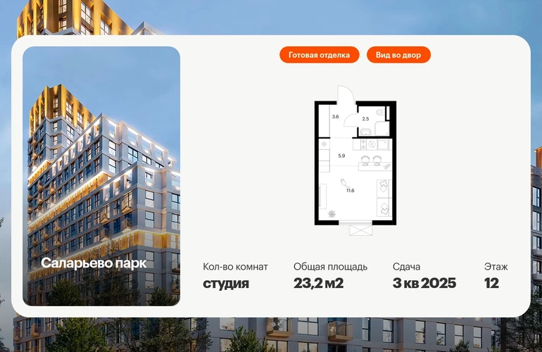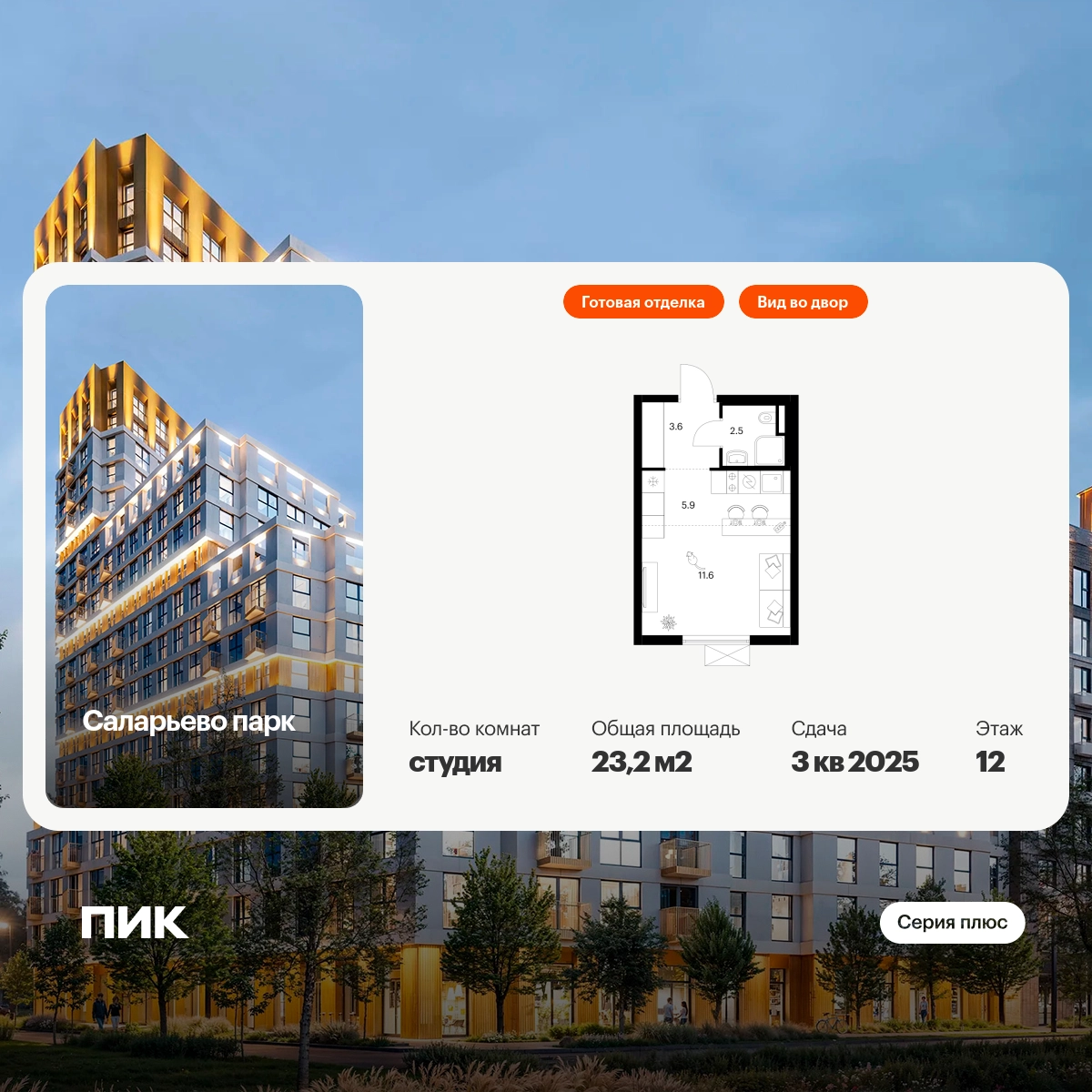 Продаётся квартира-студия площадью 23.20 кв.м на 12 этаже 24 этажного дома (Корпус 68.5, секция 5) проекта ПИК Саларьево парк. Светлый просторный подъезд на уровне земли, функциональная планировка, большие окна, с отделкой. Жилой район «Саларьево парк» расположен в Новой Москве, в четырёх километрах от МКАД по Киевскому шоссе. Две станции метро: «Саларьево» и «Филатов луг» — находятся в пешей доступности от проекта. Дойти до них можно за 5–10 минут. В квартале уже создана качественная среда, где есть абсолютно всё для полноценной жизни, работы и отдыха. «Саларьево парк» — не просто квартал, а полноценный жилой район, который отличается разноплановой архитектурой. Над концепцией квартала работали несколько ведущих архитектурных бюро, которые стремились добиться разнообразия в фасадных решениях. Ярким примером такого подхода станет корпус 83, который относится к «Серии плюс». Новый корпус 83 был создан по принципам южной архитектуры: расслабленный и лаконичный силуэт зданий, привлекающий к себе внимание. Архитектурная изюминка 83-го корпуса — террасы и фигурные балконы. Вместе с окнами и другими акцентными элементами они создают уникальный облик здания, отсылая нас к изысканной южной архитектуре. Все корпуса в квартале гармонично сочетаются, образуя единую городскую среду. Здесь приятно гулять и проводить время на улице всей семьёй. В «Саларьево парке» создана уникальная образовательная среда, включающая в себя шесть школ, рассчитанных на 6 250 учеников. Две из них уже открыты, их посещает 2 300 детей. Также на территории «Саларьево парка» находится 12 детских садов, один из которых с бассейном. Сейчас уже открыты 7 садов. В «Саларьево парке» открыта уникальная игровая площадка — PlayHub «Оригами». Здесь есть ручей, горка-труба и рельефные холмы. Взрослые смогут отдохнуть в уютном кафе, пока дети играют. Также на территории проекта есть SportHub — большая спортивная зона, разделённая по интересам и возрастам. Здесь можно заниматься разными видами спорта: футболом, баскетболом, волейболом и стритболом. Зимой центральную часть площадки превращают в каток. Во дворах-парках жилого квартала есть места для отдыха, детские и спортивные площадки. На первых этажах домов расположены магазины, кафе и полезные сервисы. Также вблизи проекта есть несколько масштабных торговых центров. До ТЦ «Саларис» пять минут пешком, до «Рио», Metro Cash & Carry и «Лемана про» — пять минут на автомобиле. Артикул - 867933О застройщике