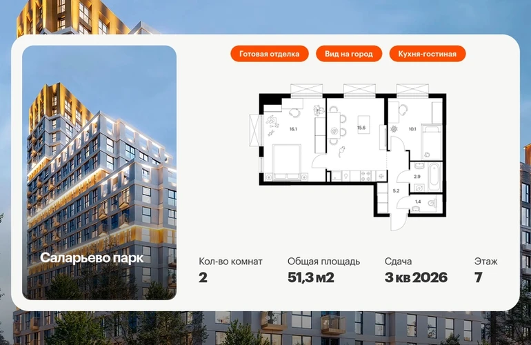 Продаётся 2-комн.квартира площадью 51.30 кв.м на 7 этаже 17 этажного дома (Корпус 20, секция 1) проекта ПИК Саларьево парк. Светлый просторный подъезд на уровне земли, функциональная планировка, большие окна, с отделкой. Жилой район «Саларьево парк» расположен в Новой Москве, в четырёх километрах от МКАД по Киевскому шоссе. Две станции метро: «Саларьево» и «Филатов луг», — находятся в пешей доступности от проекта. Дойти до них можно за 5–10 минут. В квартале уже создана качественная среда, где есть абсолютно всё для полноценной жизни, работы и отдыха. «Саларьево парк» — не просто квартал, а полноценный жилой район, который отличается разноплановой архитектурой. Над концепцией квартала работали несколько ведущих архитектурных бюро, которые стремились добиться разнообразия в фасадных решениях. Ярким примером такого подхода станут корпуса 82 и 83, которые относятся к «Серии плюс». Новый корпус 83 был создан по принципам южной архитектуры: расслабленный и лаконичный силуэт зданий, привлекающий к себе внимание. Архитектурная изюминка 83-го корпуса — террасы и фигурные балконы. Вместе с окнами и другими акцентными элементами они создают уникальный облик здания, отсылая нас к изысканной южной архитектуре. Все корпуса в квартале гармонично сочетаются, образуя единую городскую среду. Здесь приятно гулять и проводить время на улице всей семьёй. В «Саларьево парке» создана уникальная образовательная среда, включающая в себя шесть школ, рассчитанных на 6 250 учеников. Четыре из них уже открыты, их посещает 2 300 детей. Также на территории «Саларьево парка» находится 12 детских садов, один из которых с бассейном. Сейчас уже открыты 8 садов. В «Саларьево парке» открыта уникальная игровая площадка — PlayHub «Оригами». Здесь есть ручей, горка-труба и рельефные холмы. Взрослые смогут отдохнуть в уютном кафе, пока дети играют. Также на территории проекта есть SportHub — большая спортивная зона, разделённая по интересам и возрастам. Здесь можно заниматься разными видами спорта: футболом, баскетболом, волейболом и стритболом. Зимой центральную часть площадки превращают в каток. Во дворах-парках жилого квартала есть места для отдыха, детские и спортивные площадки. На первых этажах домов расположены магазины, кафе и полезные сервисы. Также вблизи проекта есть несколько масштабных торговых центров. До ТЦ «Саларис» пять минут пешком, до «Рио», Metro Cash & Carry и «Леруа Мерлен» — пять минут на автомобиле. Артикул - 946698О застройщике