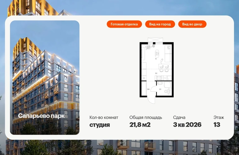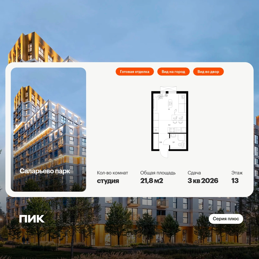 Продаётся квартира-студия площадью 21.80 кв.м на 13 этаже 16 этажного дома (Корпус 20, секция 2) проекта ПИК Саларьево парк. Светлый просторный подъезд на уровне земли, функциональная планировка, большие окна, с отделкой. Артикул - 946962О застройщике