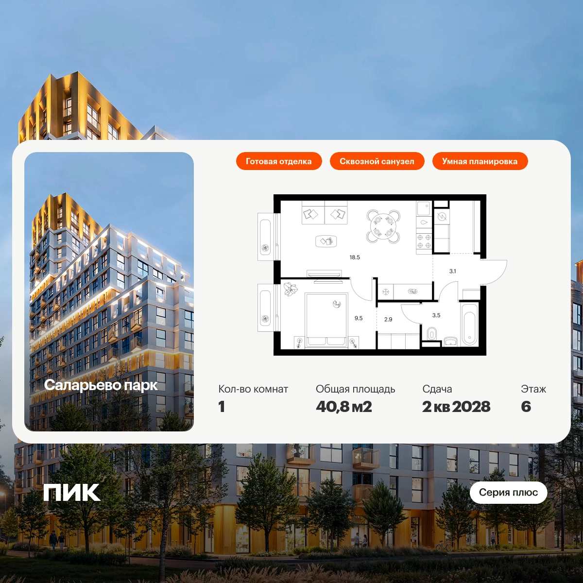Продаётся 1-комн.квартира площадью 40.80 кв.м на 6 этаже 18 этажного дома (Корпус 74.9, секция 9) проекта ПИК Саларьево парк. Светлый просторный подъезд на уровне земли, функциональная планировка, большие окна, с отделкой. Жилой район «Саларьево парк» расположен в Новой Москве, в четырёх километрах от МКАД по Киевскому шоссе. Две станции метро: «Саларьево» и «Филатов луг» — находятся в пешей доступности от проекта. Дойти до них можно за 5–10 минут. В квартале уже создана качественная среда, где есть абсолютно всё для полноценной жизни, работы и отдыха. «Саларьево парк» — не просто квартал, а полноценный жилой район, который отличается разноплановой архитектурой. Над концепцией квартала работали несколько ведущих архитектурных бюро, которые стремились добиться разнообразия в фасадных решениях. Ярким примером такого подхода станет корпус 83, который относится к «Серии плюс». Новый корпус 83 был создан по принципам южной архитектуры: расслабленный и лаконичный силуэт зданий, привлекающий к себе внимание. Архитектурная изюминка 83-го корпуса — террасы и фигурные балконы. Вместе с окнами и другими акцентными элементами они создают уникальный облик здания, отсылая нас к изысканной южной архитектуре. Все корпуса в квартале гармонично сочетаются, образуя единую городскую среду. Здесь приятно гулять и проводить время на улице всей семьёй. В «Саларьево парке» создана уникальная образовательная среда, включающая в себя шесть школ, рассчитанных на 6 250 учеников. Две из них уже открыты, их посещает 2 300 детей. Также на территории «Саларьево парка» находится 12 детских садов, один из которых с бассейном. Сейчас уже открыты 7 садов. В «Саларьево парке» открыта уникальная игровая площадка — PlayHub «Оригами». Здесь есть ручей, горка-труба и рельефные холмы. Взрослые смогут отдохнуть в уютном кафе, пока дети играют. Также на территории проекта есть SportHub — большая спортивная зона, разделённая по интересам и возрастам. Здесь можно заниматься разными видами спорта: футболом, баскетболом, волейболом и стритболом. Зимой центральную часть площадки превращают в каток. Во дворах-парках жилого квартала есть места для отдыха, детские и спортивные площадки. На первых этажах домов расположены магазины, кафе и полезные сервисы. Также вблизи проекта есть несколько масштабных торговых центров. До ТЦ «Саларис» пять минут пешком, до «Рио», Metro Cash & Carry и «Лемана про» — пять минут на автомобиле. Артикул - 1007309О застройщике