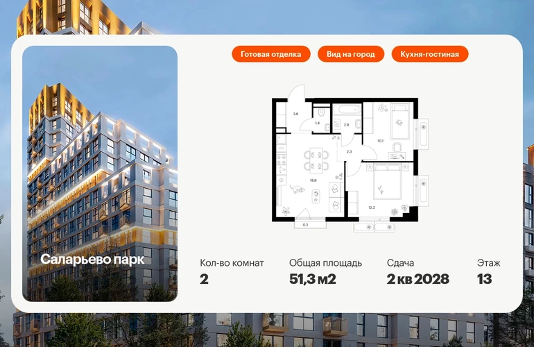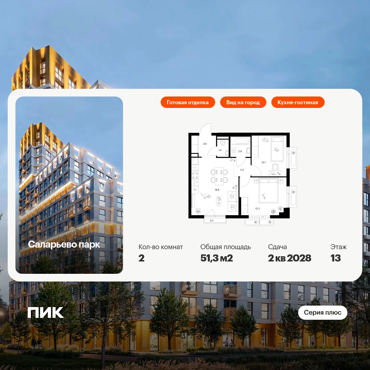 Продаётся 2-комн.квартира площадью 51.30 кв.м на 13 этаже 18 этажного дома (Корпус 74.9, секция 9) проекта ПИК Саларьево парк. Светлый просторный подъезд на уровне земли, функциональная планировка, большие окна, с отделкой. Жилой район «Саларьево парк» расположен в Новой Москве, в четырёх километрах от МКАД по Киевскому шоссе. Две станции метро: «Саларьево» и «Филатов луг», — находятся в пешей доступности от проекта. Дойти до них можно за 5–10 минут. В квартале уже создана качественная среда, где есть абсолютно всё для полноценной жизни, работы и отдыха. «Саларьево парк» — не просто квартал, а полноценный жилой район, который отличается разноплановой архитектурой. Над концепцией квартала работали несколько ведущих архитектурных бюро, которые стремились добиться разнообразия в фасадных решениях. Ярким примером такого подхода станут корпуса 82 и 83, которые относятся к «Серии плюс». Новый корпус 83 был создан по принципам южной архитектуры: расслабленный и лаконичный силуэт зданий, привлекающий к себе внимание. Архитектурная изюминка 83-го корпуса — террасы и фигурные балконы. Вместе с окнами и другими акцентными элементами они создают уникальный облик здания, отсылая нас к изысканной южной архитектуре. Все корпуса в квартале гармонично сочетаются, образуя единую городскую среду. Здесь приятно гулять и проводить время на улице всей семьёй. В «Саларьево парке» создана уникальная образовательная среда, включающая в себя шесть школ, рассчитанных на 6 250 учеников. Четыре из них уже открыты, их посещает 2 300 детей. Также на территории «Саларьево парка» находится 12 детских садов, один из которых с бассейном. Сейчас уже открыты 8 садов. В «Саларьево парке» открыта уникальная игровая площадка — PlayHub «Оригами». Здесь есть ручей, горка-труба и рельефные холмы. Взрослые смогут отдохнуть в уютном кафе, пока дети играют. Также на территории проекта есть SportHub — большая спортивная зона, разделённая по интересам и возрастам. Здесь можно заниматься разными видами спорта: футболом, баскетболом, волейболом и стритболом. Зимой центральную часть площадки превращают в каток. Во дворах-парках жилого квартала есть места для отдыха, детские и спортивные площадки. На первых этажах домов расположены магазины, кафе и полезные сервисы. Также вблизи проекта есть несколько масштабных торговых центров. До ТЦ «Саларис» пять минут пешком, до «Рио», Metro Cash & Carry и «Леруа Мерлен» — пять минут на автомобиле. Артикул - 1007405О застройщике
